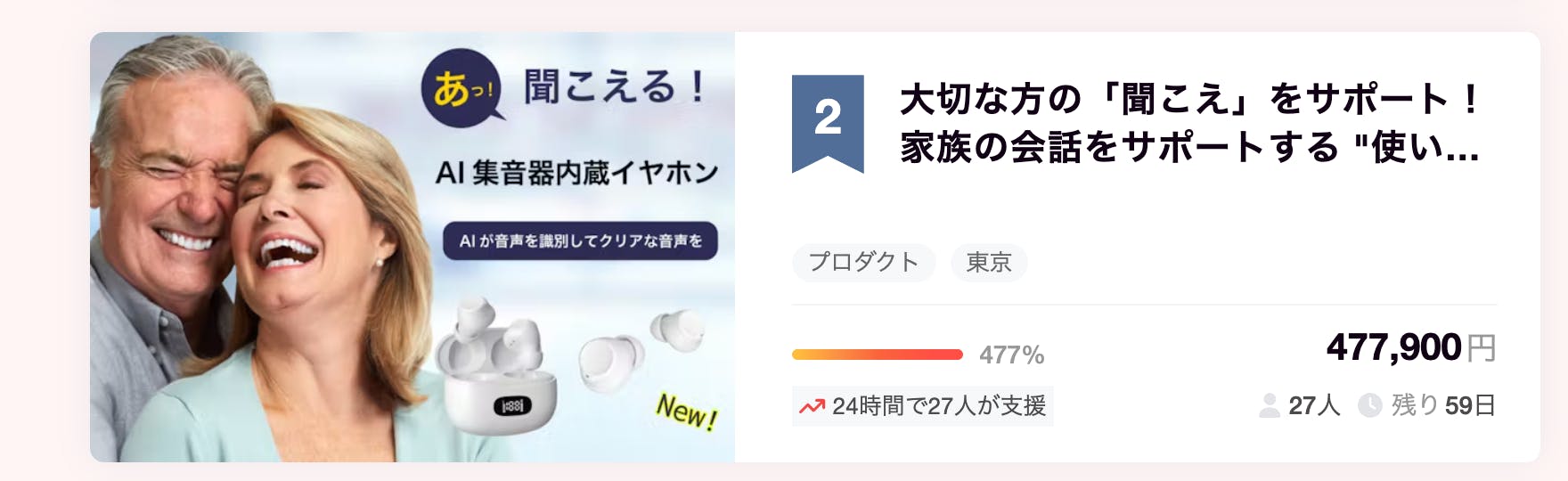 昨日からスタートしました「聞こえ」をサポートする集音器イヤホン KIKOE EARのプロジェクトですが、開始からわずか1時間ほどで目標の100%を達成!