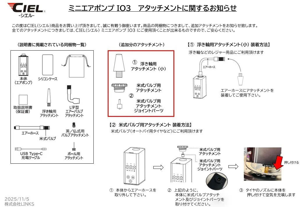 なお、全てのアタッチメントにつきましては、CIEL(シエル) ミニエアポンプ IO3 に