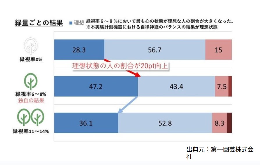 例えば「緑視率(人の視界に占める緑の割合)」は、6〜8%の範囲で自律神経が安定しやすくなるとする研究報告があります。