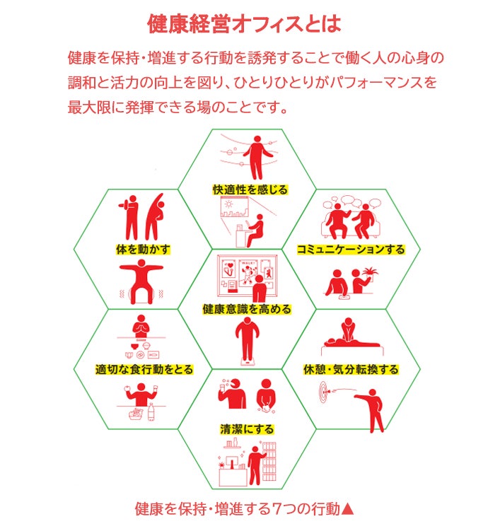 健康経営オフィスとは、健康を保持・増進する行動を誘発することで、働く人の心身の調和と活力の向上を図り、ひとりひとりがパフォーマンスを最大限に発揮できる場のことです。