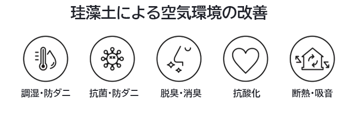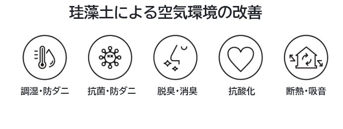 ①空気質 『空気質』では珪藻土を活用し、ヒトにとっての快適な湿度の担保やカビやダニ、ウイルスの増殖を抑え、化学物質を中和、また抗酸化空間に近づけ、働く人の未病に貢献します。