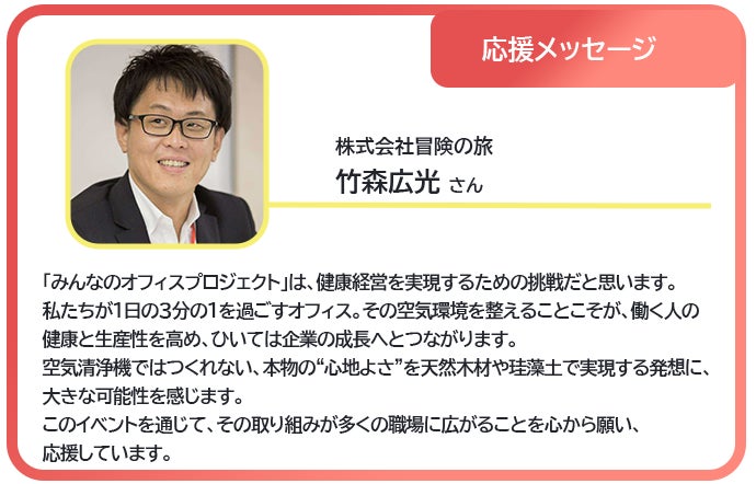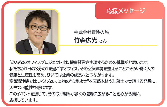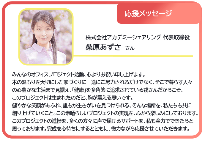 みんなのオフィスプロジェクト、大いに賛同いたします。 ・自然素材を使った空間づくり →全国で放置されているスギ・ヒノキの人工林を間伐して素材として役立てて欲しいです! ・働く人の心と身体をほぐし個性が輝く共生社会を実現したい →世の中全体がストレスの塊の様に凝っていますので、リラックス出来て、かつ集中力を高められる空間をどんどん創って欲しいです! 戎さん、応援していますので頑張って下さい!!!