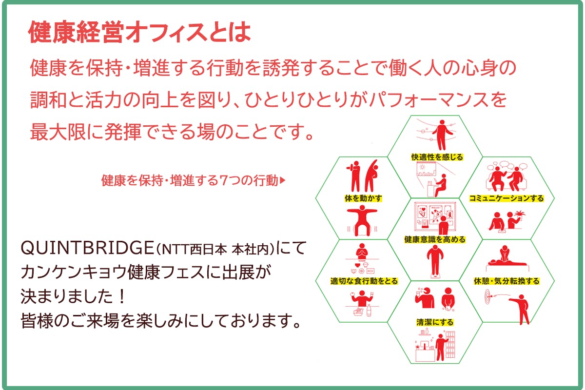 私たちは、心地よい職場空間を自分たちの手でつくる「みんなのオフィスプロジェクト」を、カンケンキョウ健康経営フェスティバルにて出展します。
