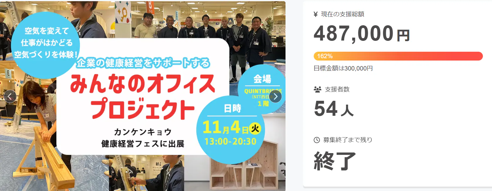 2025/10/30 12:24いつも大変お世話になっております。そしてこの度は大変お世話になりました!戎健太郎でございます。皆さまのあたたかいご支援のおかげで、この度、54人もの方々にご支援をいただき、目標金額の160%にてプロジェクトを達成することができました。たくさんのお声がけや、あたたかい心づかいをいただきましたこと、心より感謝申し上げます。ご支援いただいた資金は、来週11月4日(火)13時から開催する、下記健康経営フェスの出展費用として、大切に活用させていただきます。関西・健康経営推進協議会 健康経営フェス(下記URLより参加申込可能)https://www.quintbridge.jp/event/detail/202510031230.html返礼品につきましては、これから個別にメッセージをお送りさせていただきますので、よろしくお願いいたします。そしてプロジェクトとしては、これからが本番となります。オフィスから“空気”を変えることで、人を大切にする社会をつくって参りたいと存じますので、引き続き応援いただけますと幸いです。そうぞよろしくお願いいたします。 もっと見る