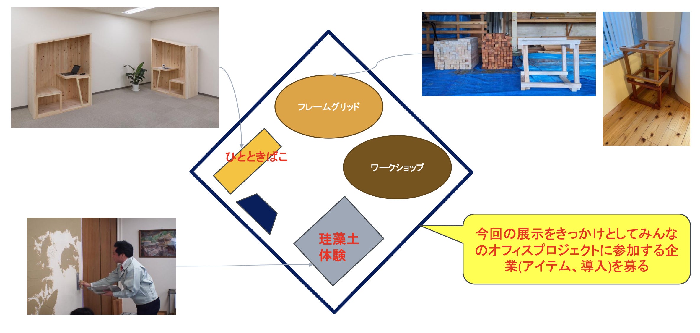 だから大人が長時間滞在するオフィスに届け、会社や働く人がヒトにとっての良い環境が何かを感じていただきたいと、木や珪藻土を使ったオフィスリノベ活動を開始しました。