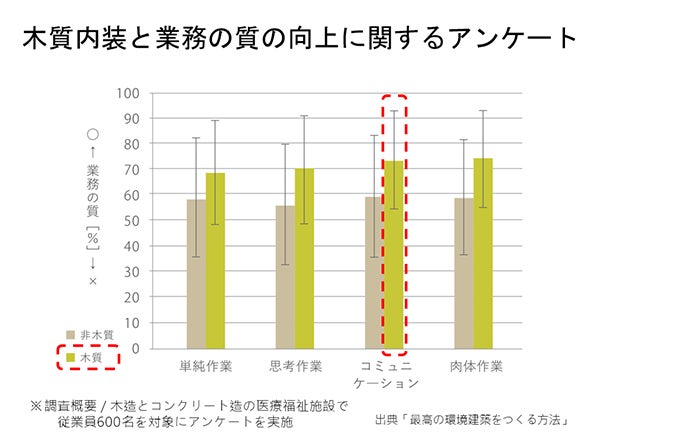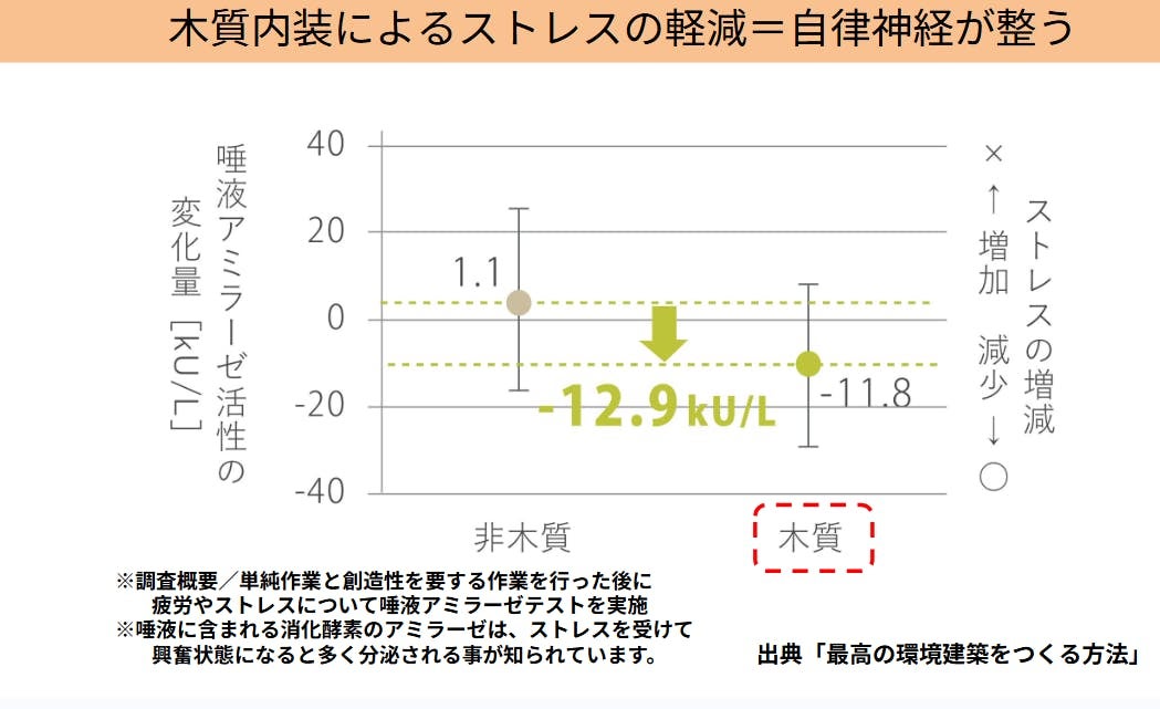 実際に木質内装の空間では、ストレスホルモンであるコルチゾールの分泌が減少したというデータもあります。