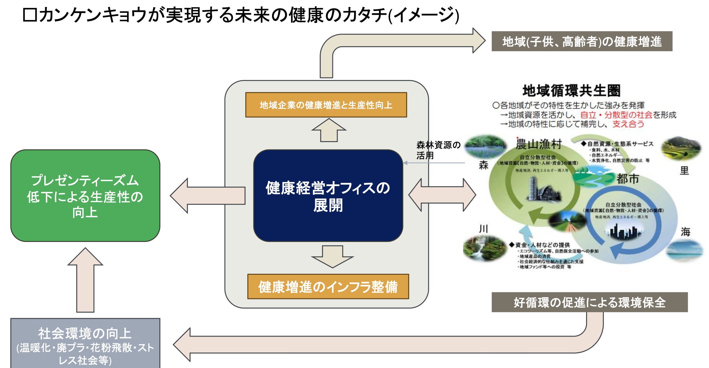 カンケンキョウでは、地域資源を活かしながら「健康経営オフィス」を展開することで、働く人・企業・地域・環境にとって好循環を生み出す取り組みです。