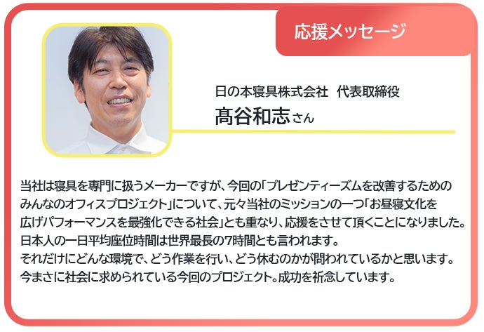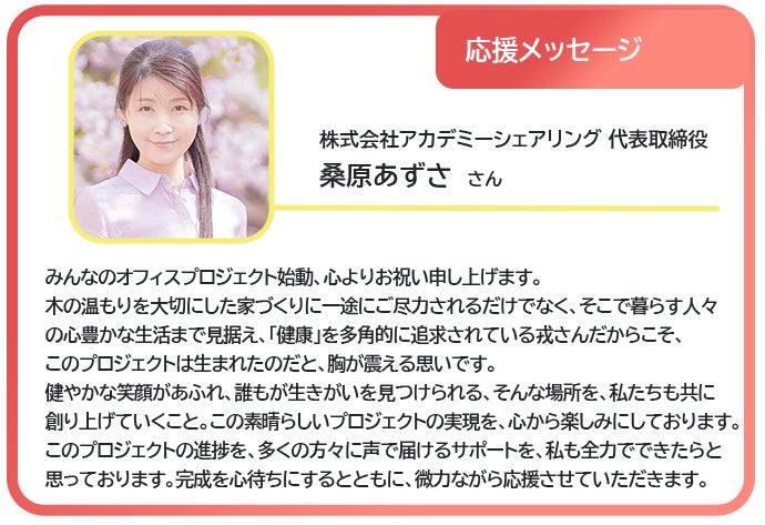 みんなのオフィスプロジェクト、大いに賛同いたします。 ・自然素材を使った空間づくり →全国で放置されているスギ・ヒノキの人工林を間伐して素材として役立てて欲しいです! ・働く人の心と身体をほぐし個性が輝く共生社会を実現したい →世の中全体がストレスの塊の様に凝っていますので、リラックス出来て、かつ集中力を高められる空間をどんどん創って欲しいです! 戎さん、応援していますので頑張って下さい!!!