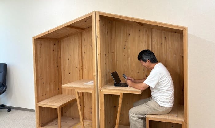 私たちが開発した「ひとときばこ」は、六甲山ヒノキという地域材を贅沢に使った、集中力が高まる小さな空間です。