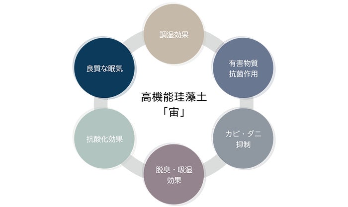 ①空気質 『空気質』では珪藻土を活用し、ヒトにとっての快適な湿度の担保やカビやダニ、ウイルスの増殖を抑え、化学物質を中和、また抗酸化空間に近づけ、働く人の未病に貢献します。