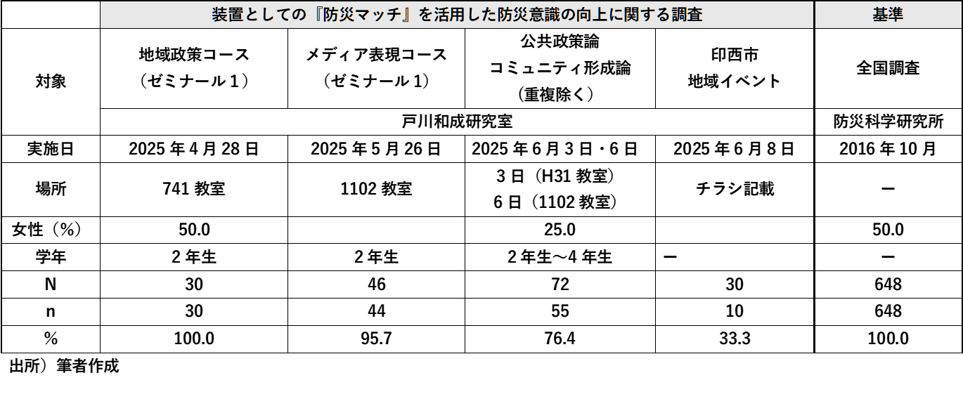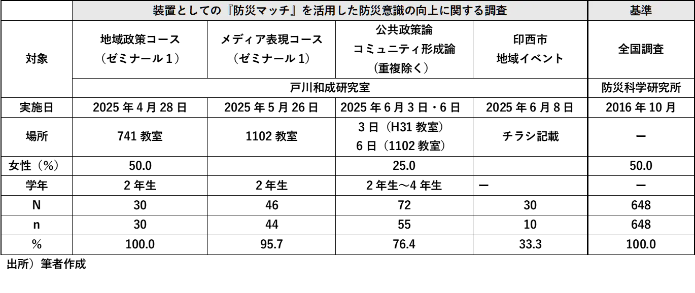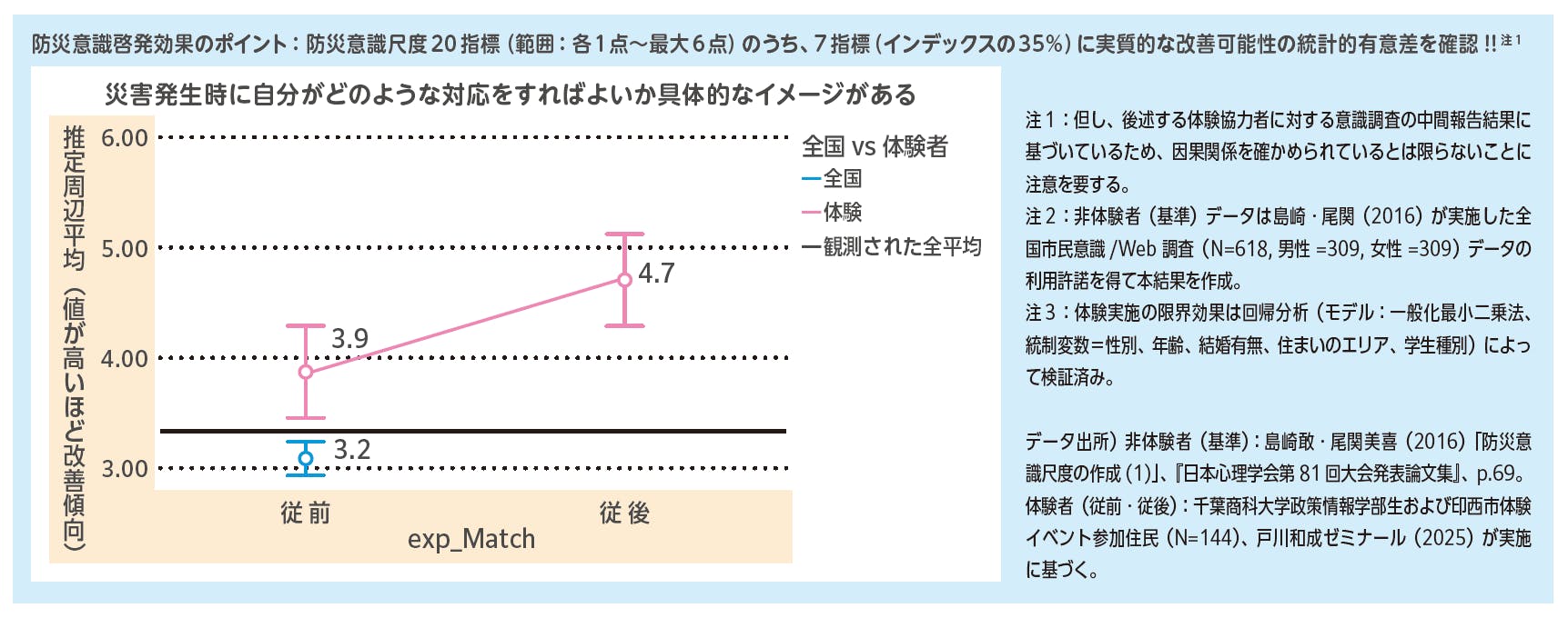 それは全国市民vs体験者(表に記載している2025年度戸川和成研究室の調査対象者:N=144名)の体験前と比べた体験後の防災意識が改善され用としている結果をもとに支持されることになります。しかしながら、これだけで因果関係を認めることはできずに継続的に調査を続けていくことが必要です。