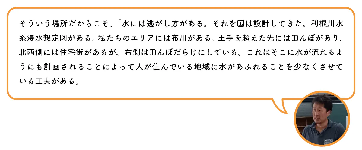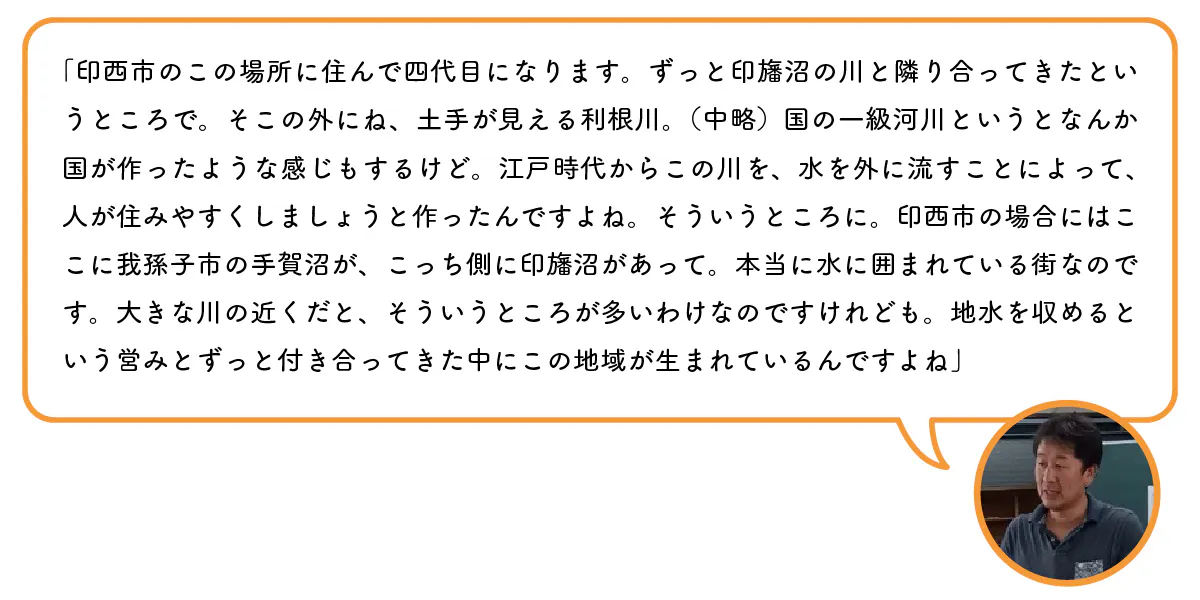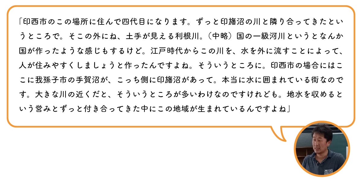 それは、取材に協力するために出向いた印西市こそ、千葉ニュータウンという新興住宅地としても有名とされています。しかしながら、それだけでなく旧市町合併の地域には印旛沼や隣接した手賀沼が存在しています。そこに向けて日本列島の反対側から流れる利根川水系の氾濫を想定したときに甚大な被害が予想されるという災害リスクの問題を人々が認識する必要があったからです。