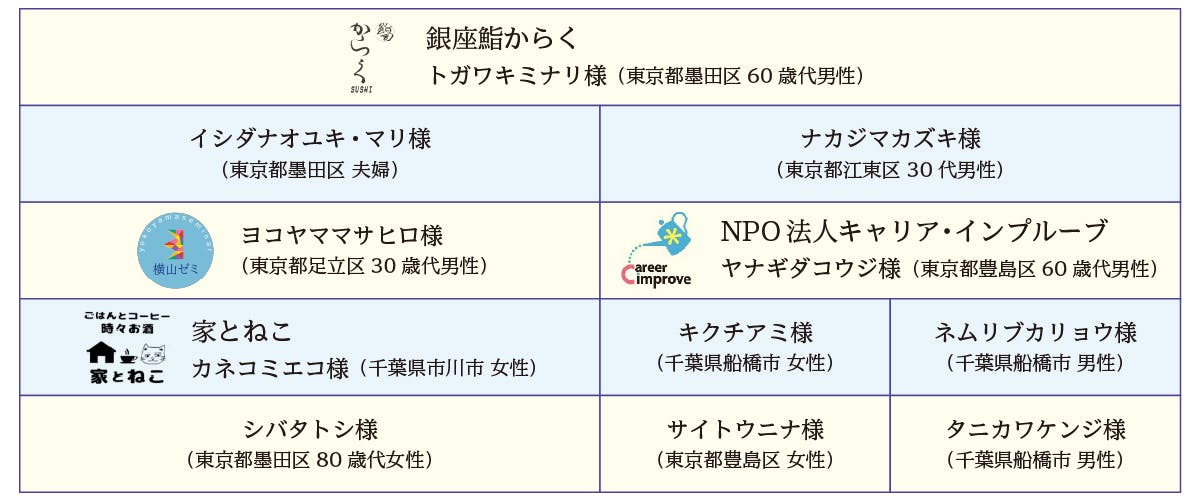 本プロジェクトに賛同して、既に応援して頂いた皆様をご紹介させてください。本当に感謝申し上げますとともに、より一層の発展を目指して本プロジェクトを遂行していきたく存じます。引き続きどうぞ、お力添えを何卒、宜しくお願い申し上げます。