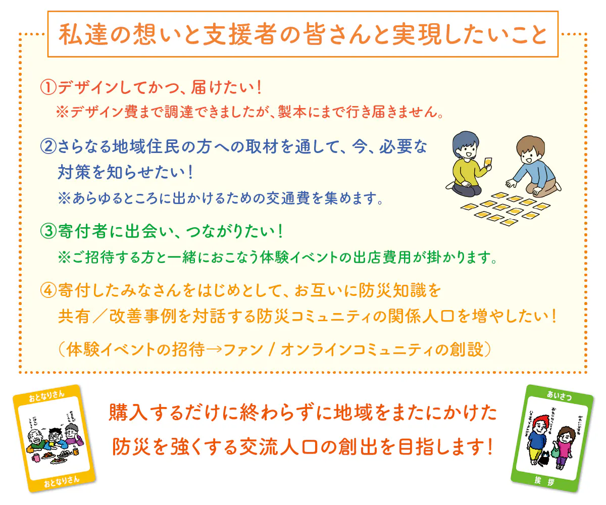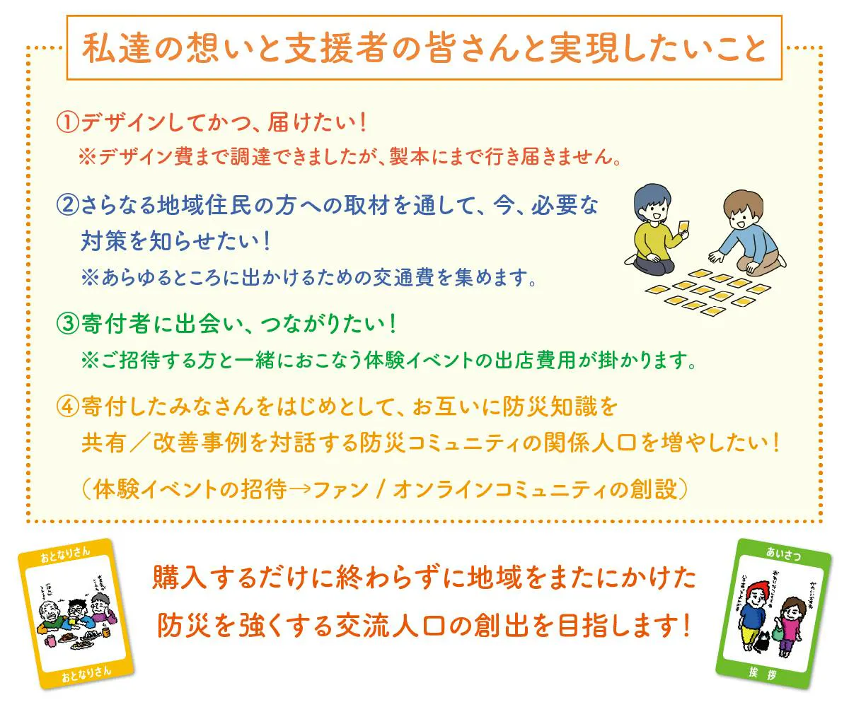 私たちは単に人々に対応を呼びかけるのではなく、居場所が必要であるからコミュニティの必要性を伝えるだけでなく、今住んでいる事情に応じて場合によっては逃げない方が良い(既に高台にいるから)ということも、自分の暮らしている場所から考える方法を伝えようとすることを重要としておりました。