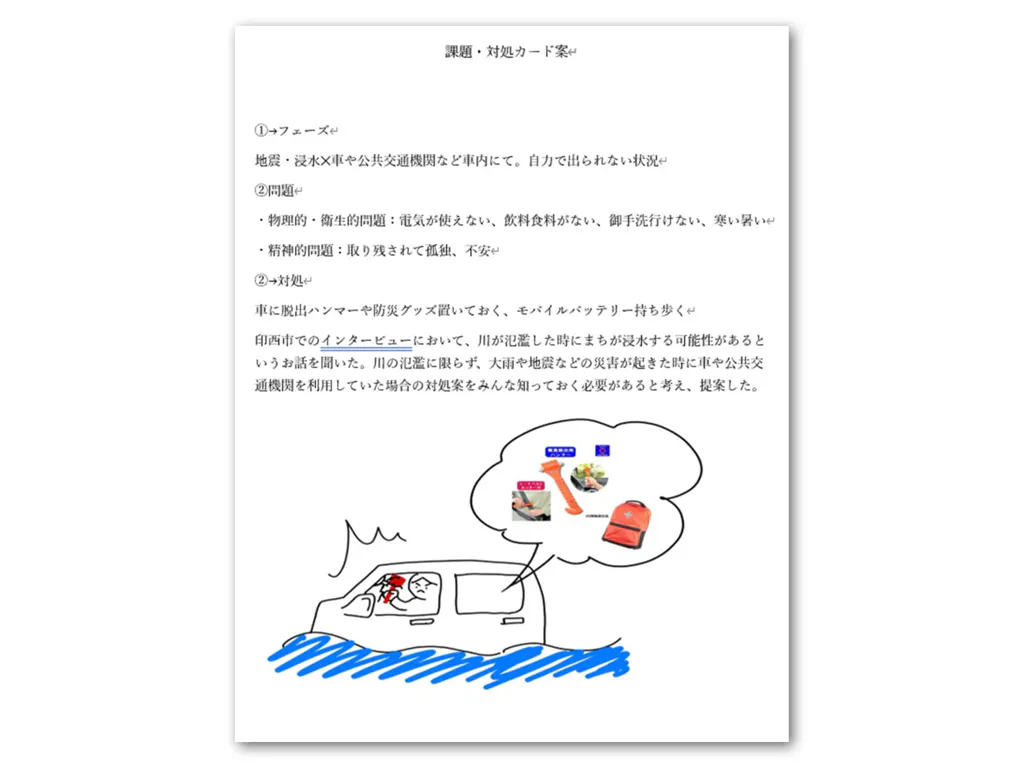 以上の活動から、戸川ゼミナールでは必ずしも防災の専門家ではないものの、人々の声に耳を傾け、防災士の知恵を借りながら新たに減災戦略を打ち出そうとしていました。 施策案を検討すること、ほぼ1年になりますが、戸川ゼミナールは取材を重ねて防災知育玩具の開発に努めました。