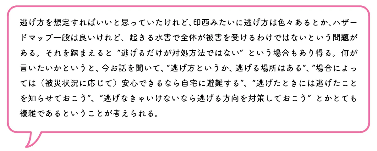 ───すなわち、対処の仕方が複線的にあることをきちんと理解している必要が被災時に求められているということに私たちは耳を傾ける必要がありました。