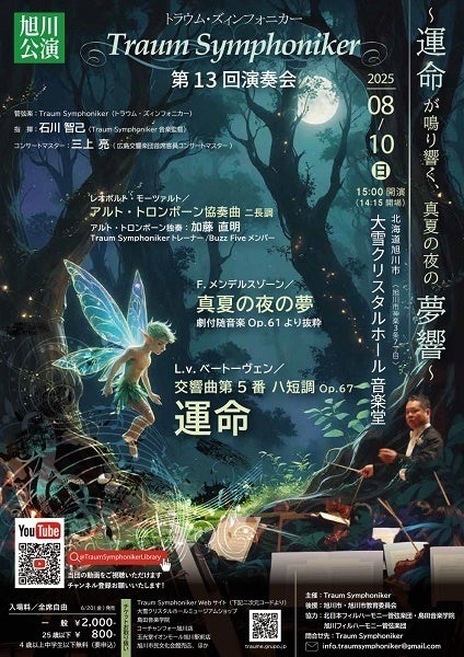 2025年8月、北海道・旭川市の大雪クリスタルホールにて開催予定の第13回演奏会「運命が鳴り響く、真夏の夜の夢響」では、全国で活躍するプロ演奏家を招き、共に音楽を創り上げます。