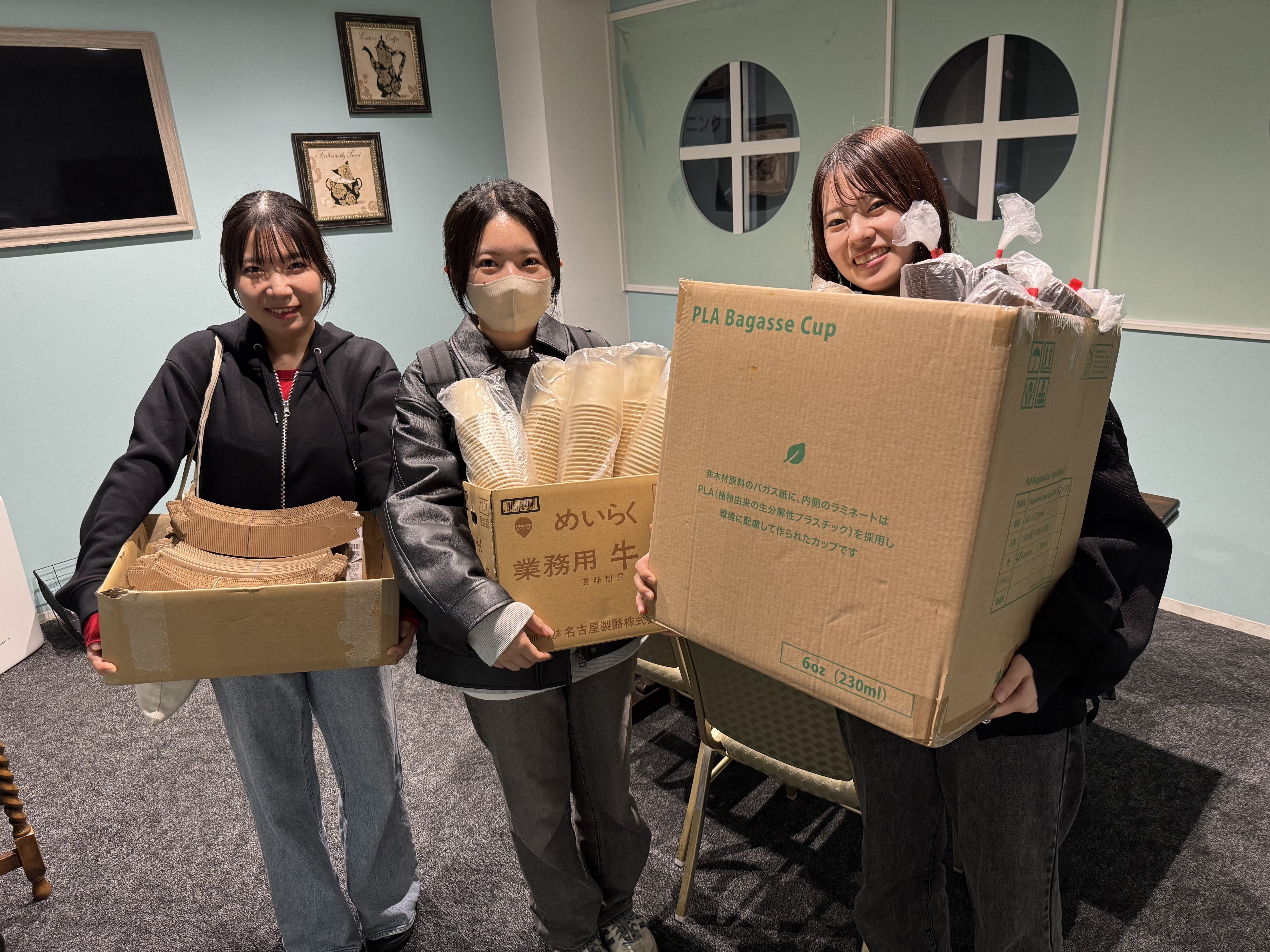 ついさきほど、今回バンテン珈琲の豆を使用して頂ける学生のみなさんがチルアウトにて、カップやスリーブなどを取りにきてくれました。