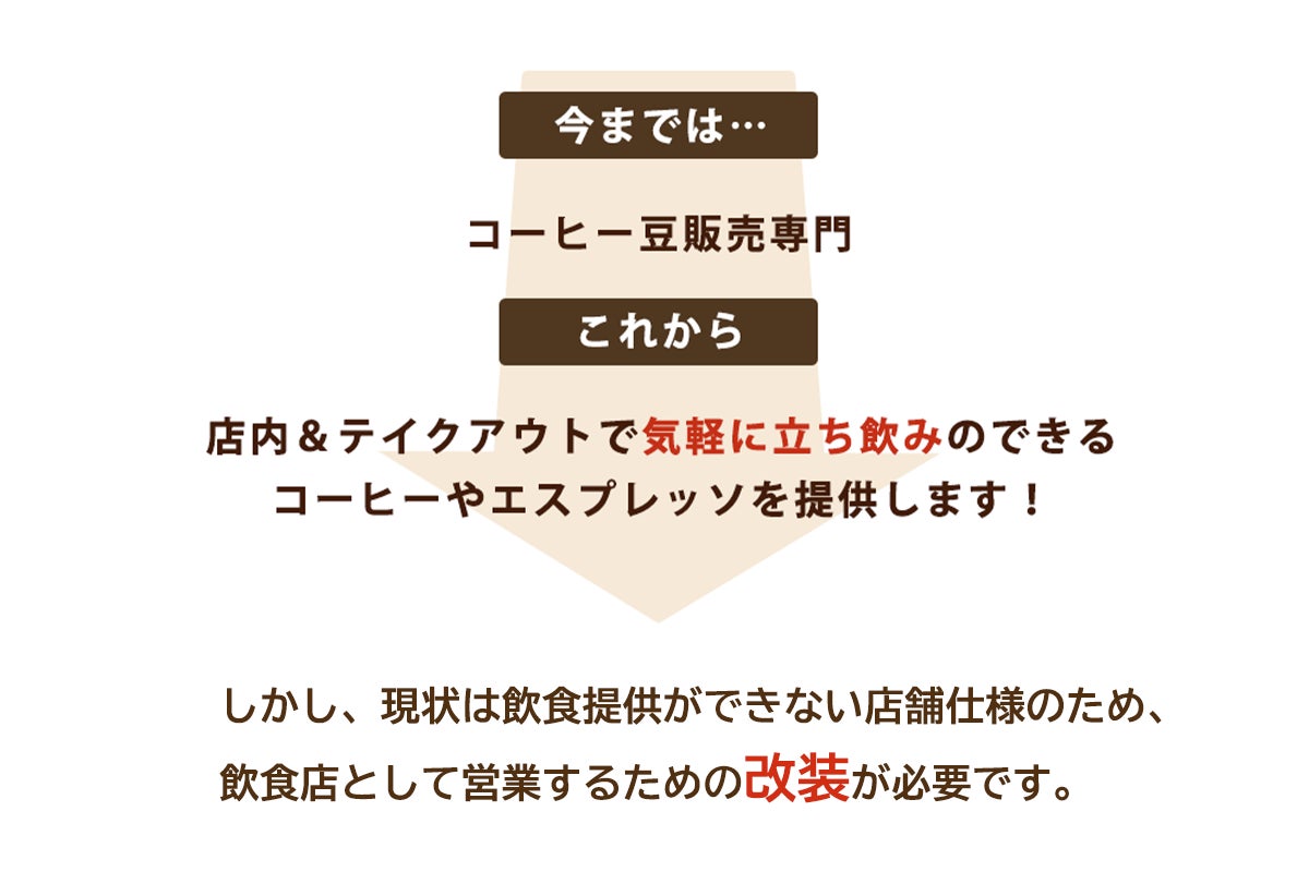 カウンターの新設、冷蔵庫、シンク、製氷機の設置、飲食店許可取得のためのレイアウト改修、エスプレッソマシン・焙煎機のオーバーホール、豆の保管棚、ディスプレイ設置、テイクアウト用カップの準備 など大幅な変更が必要です。
