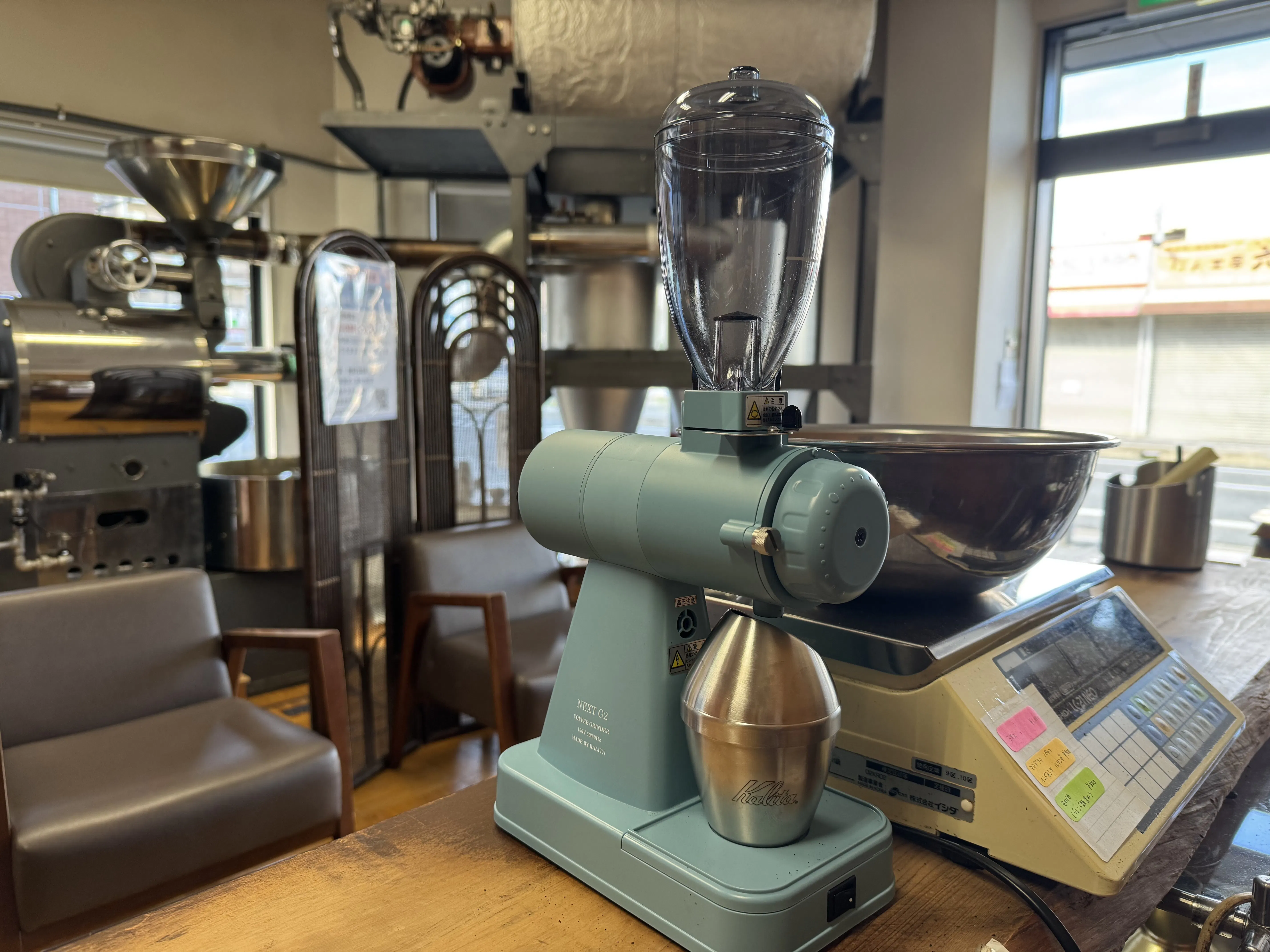 バンテンコーヒーに新しいミルが届きました。写真に載っている水色の可愛いくてコンパクトなミルはカリタ製のnext G2というモデルです。