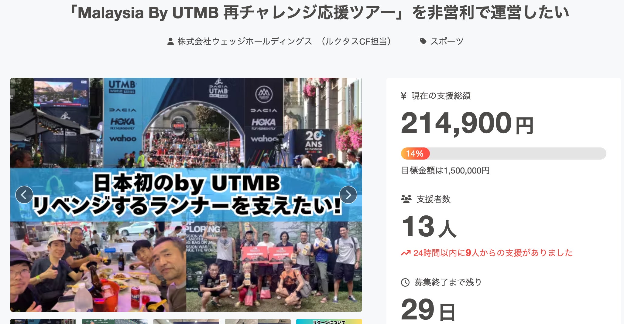 なんとかプロジェクト開始にこぎつけられてホッとしましたが、ここからが本番です。初日から多くのご支援をいただき、早くも214,900円に達しました。ありがとうございます!過酷な環境のトレイルレースで完走できなかったランナーに寄り添い、何かできることがないかと考え、生まれたのがこのプロジェクトです。失意から再びチャレンジする選手を応援したい。その想いに共感して、多くの方に協賛していただきました。リターンのレース出走権やオリジナルTシャツ、イベントなどさまさまな形での協賛です。リターンに関してはまた別の機会に、個別にご紹介してまいります。このポジティブな流れをより大きなものにして、さらに多くの方に関わっていただけるように駆け抜けていきます。よろしければ、SNSや口コミを通して、プロジェクトについて共有していただけると嬉しいです!若岡