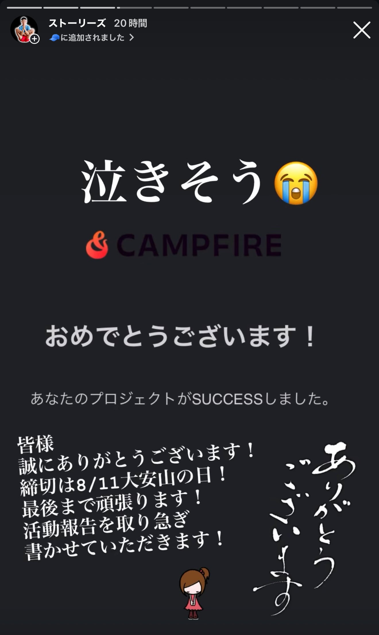 皆様のお陰で、1st Goalとして設定しておりました目標を達成することができました!皆様からのあたたかいご支援に感激しています。また、応援コメントは全て見させていただいており、とても感動しますし、気が引き締まります。旧友や元同僚、シーズンガイドを共に頑張っていた仲間、山ですれ違った方からYouTubeをご覧いただいているアウトドア人の皆様まで・・・、誠にありがとうございます。