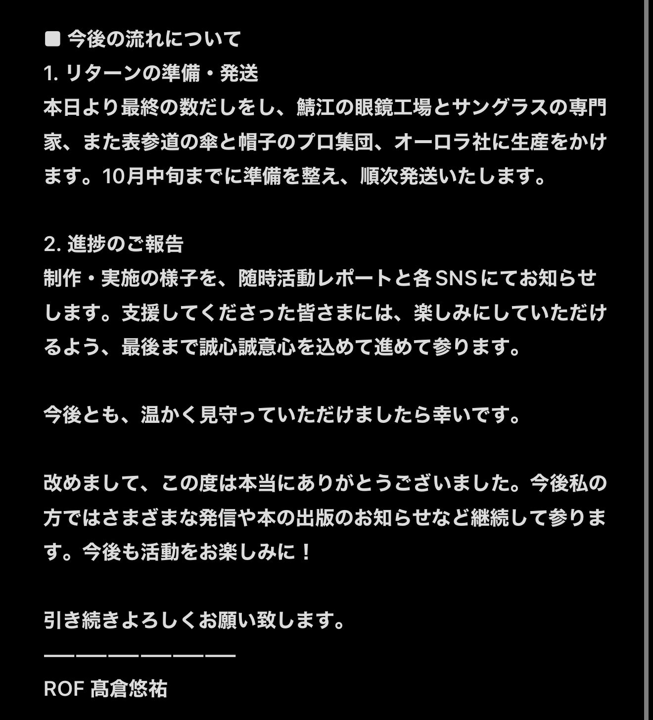 これから、量産と流通開始に向けて、全力で準備を進めてまいります。皆様のご期待に応えられるよう、一歩一歩着実に進んでいきます。また、進捗状況は定期的に活動報告やSNSを通じてお伝えしますので、引き続き見守っていただければ幸いです。