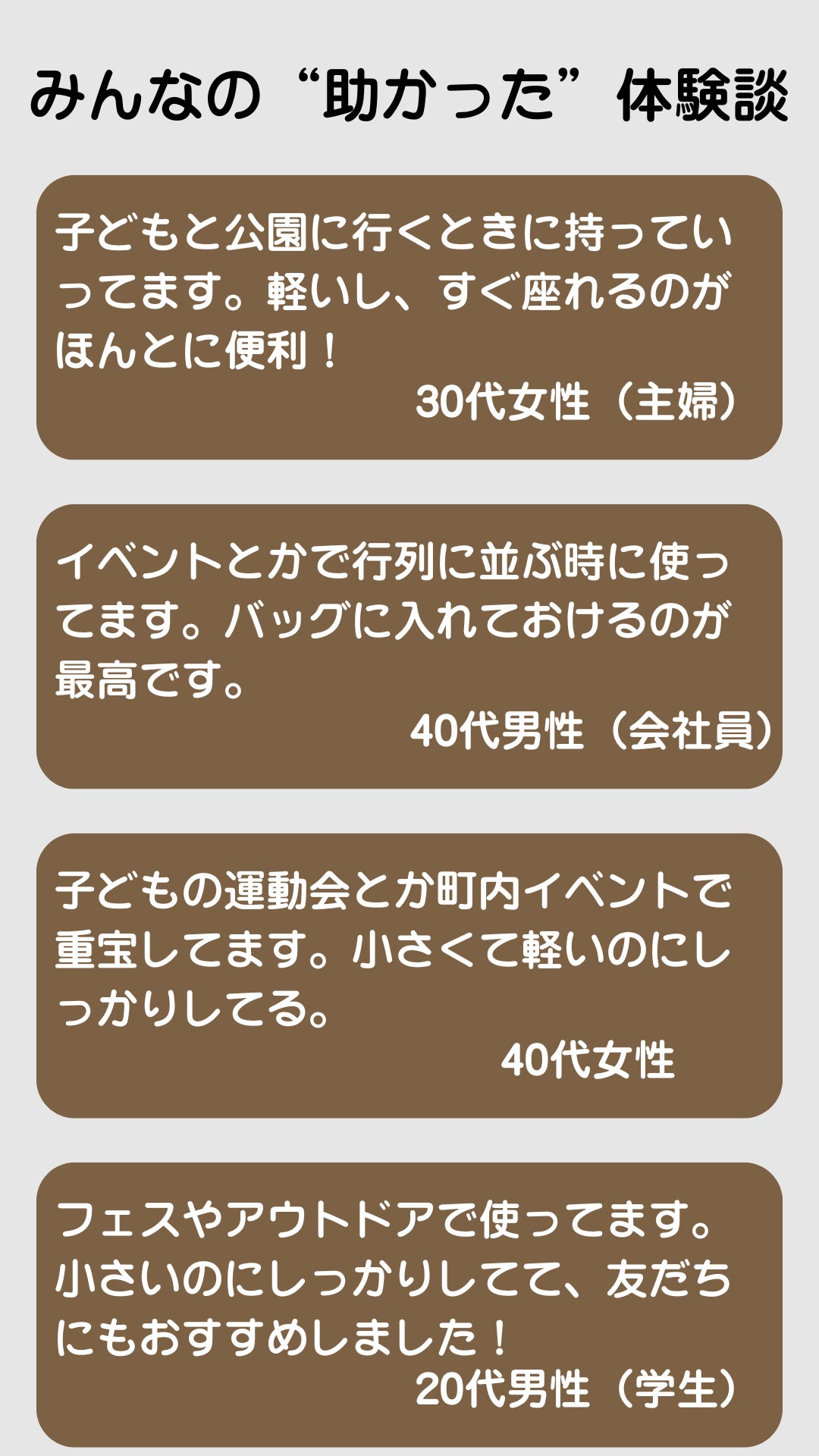 A. 公園、アウトドア、行列待ち、運動会、フェス、旅行、玄関先など幅広く活用されています。
