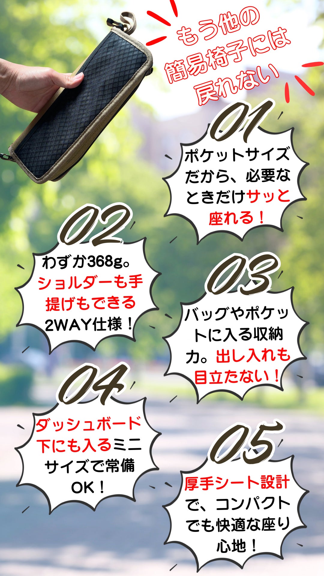 忙しいお出かけや、急な休憩にもぴったりな“すぐ使える椅子”です。