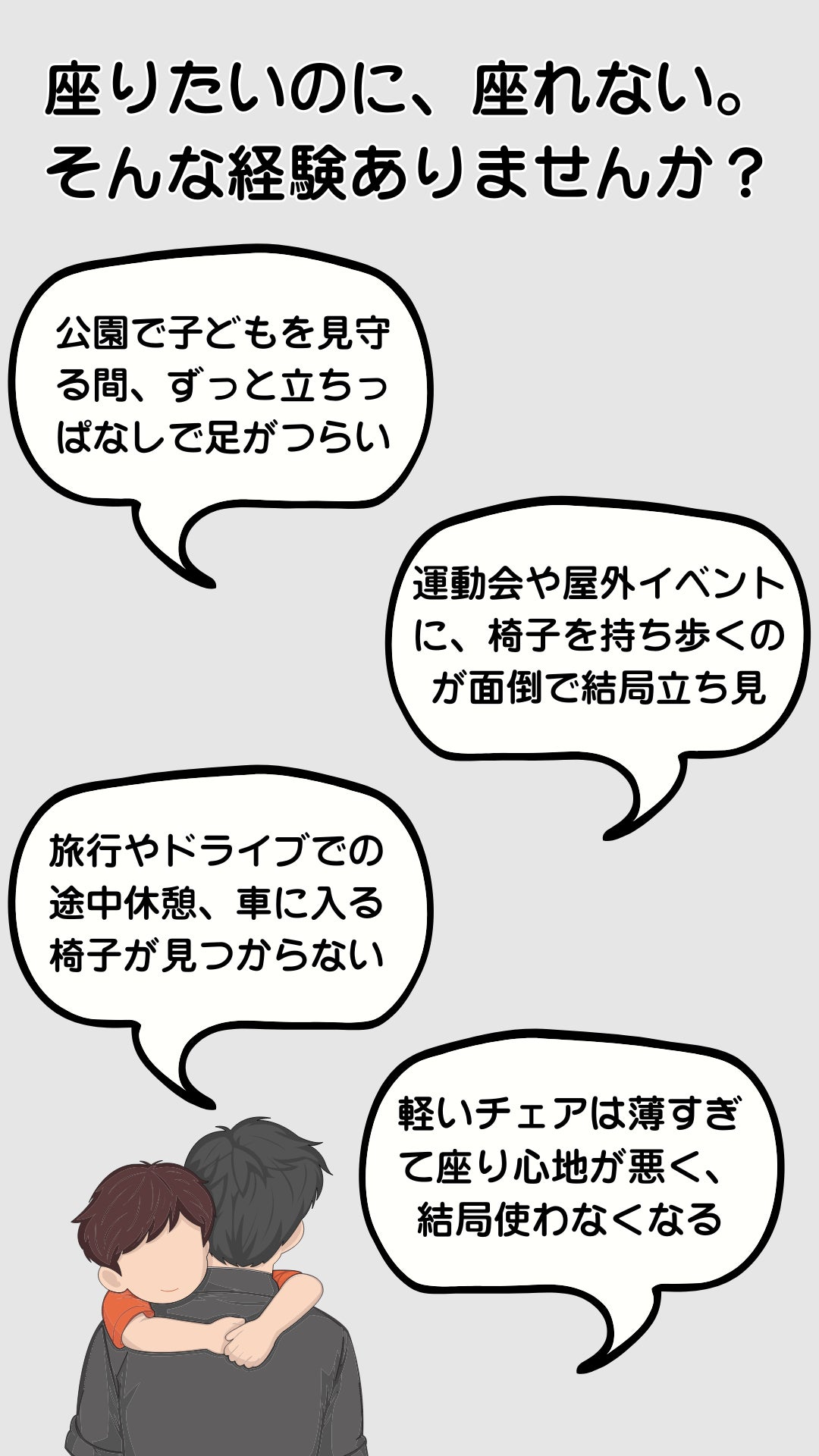 足はじんわり痛く、腰まで重くなっていくのに、座れる場所は見つからない。ベンチは満席、持ち運べる椅子は大きくて重い。結局、我慢するしかない――そんな経験はありませんか?