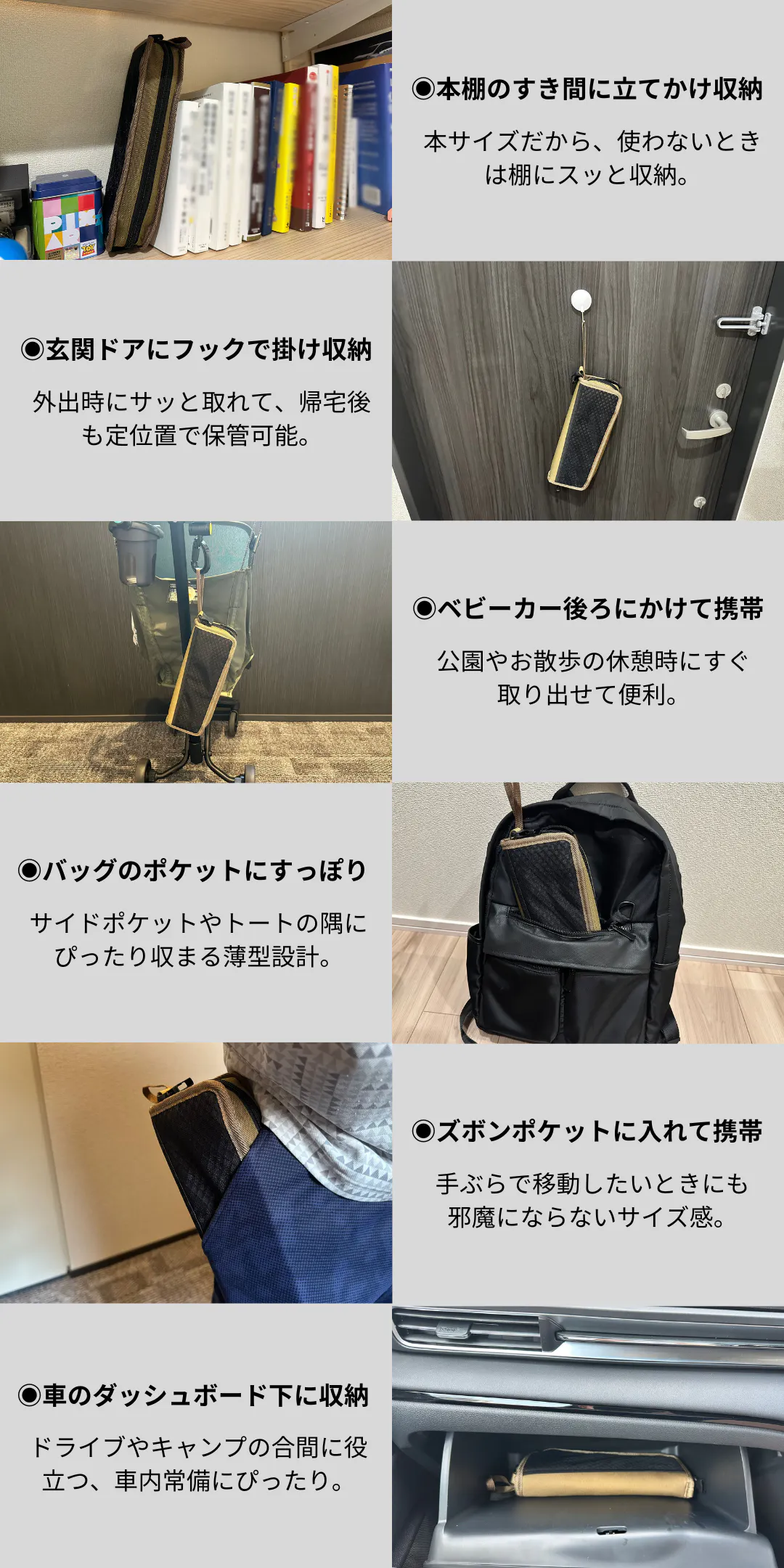 本棚のすき間や玄関ドアのフック、バッグやズボンのポケット、ベビーカーの後ろ、車のダッシュボード下など、ポケチェアは驚くほど多彩な場所にすっきり収納。持ち運びも簡単で、使いたいときにサッと取り出せる便利さが魅力です。