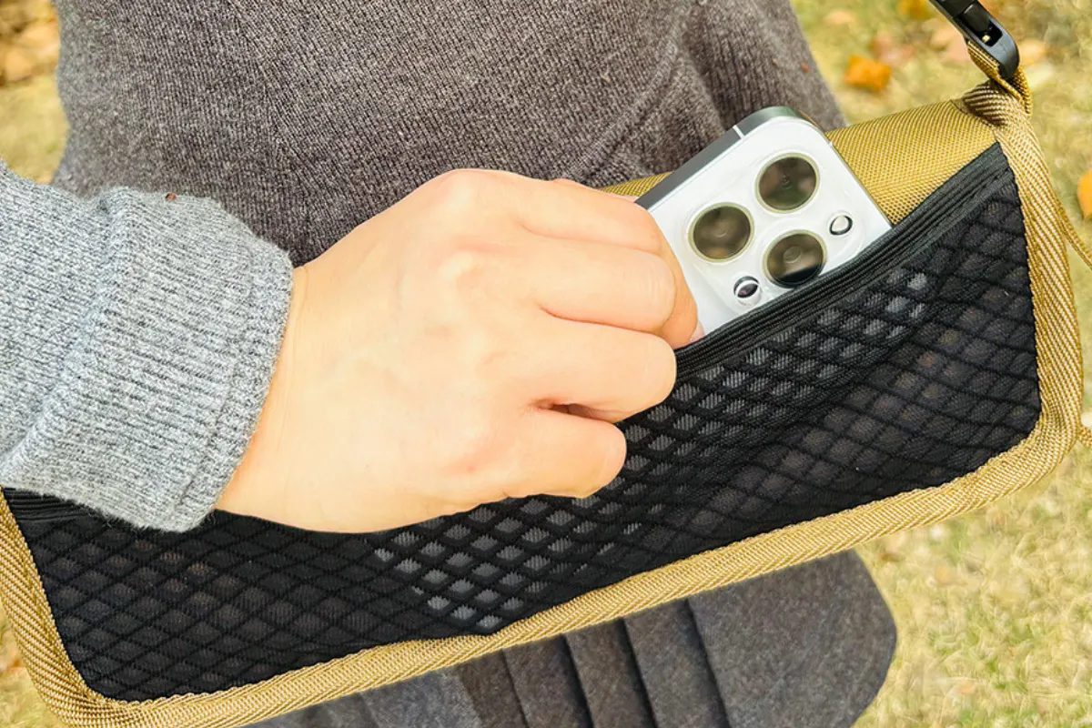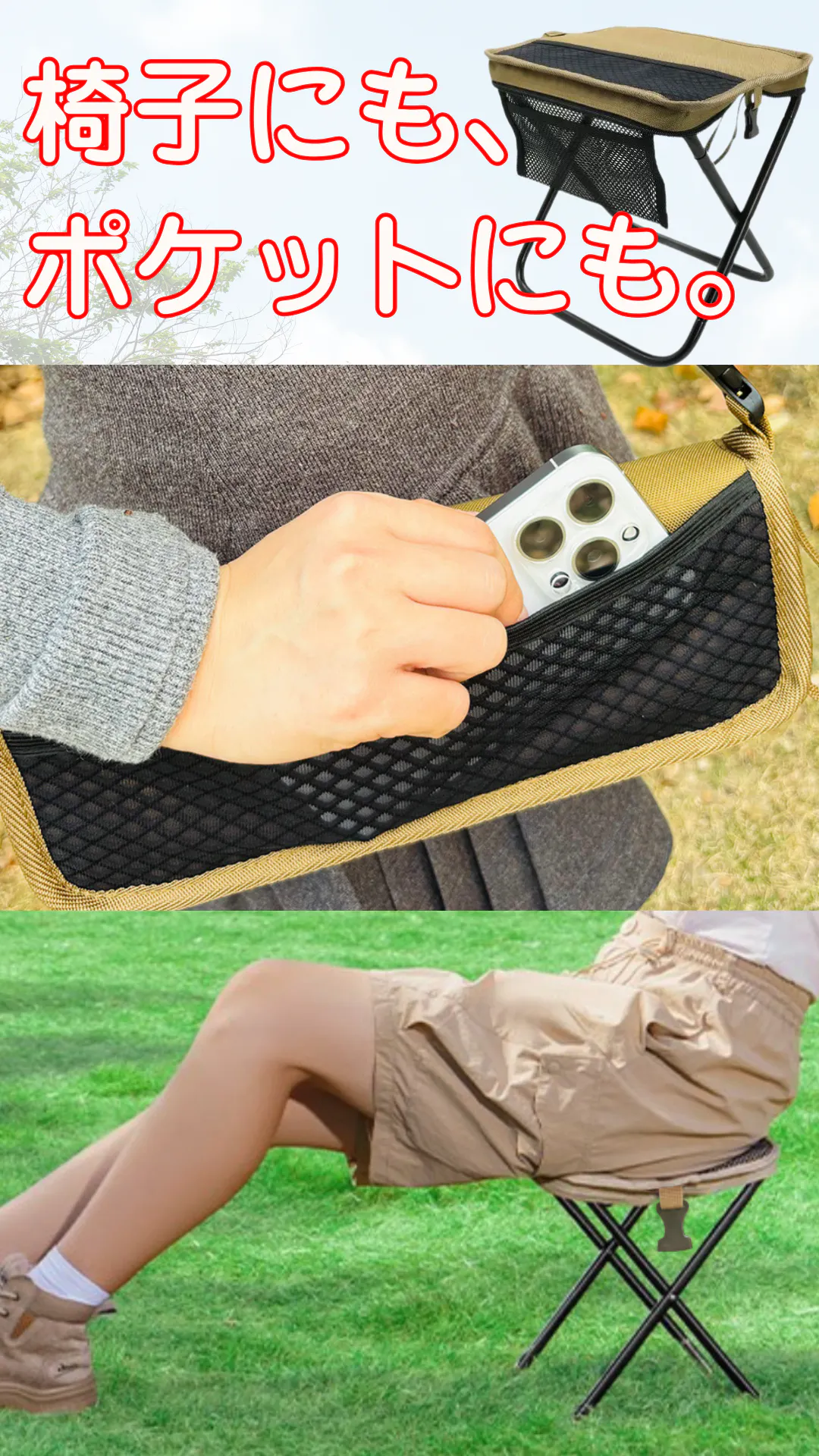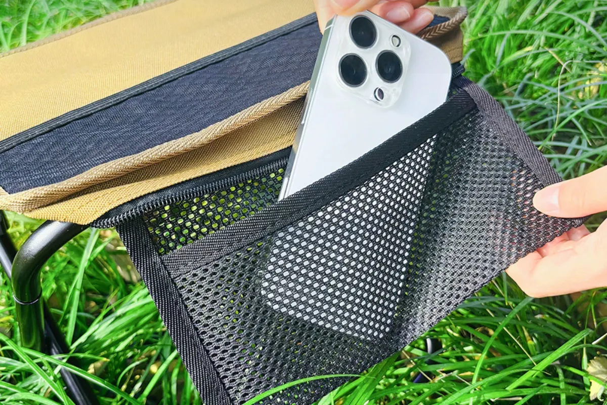 ポケチェアには、内側と外側にメッシュポケットを搭載。スマホや小さめのドリンク、ミニタオルなど、ちょっとした小物を入れるのにぴったり。座ったままでも出し入れしやすく、荷物の整理もスムーズ。ダブルポケットで使いやすさがグッと広がります。