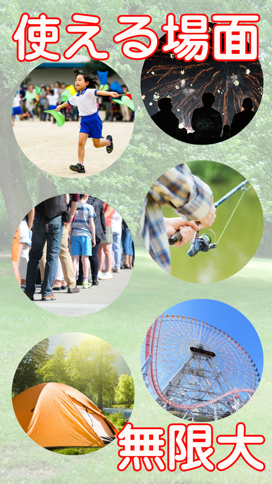 A. 公園、アウトドア、行列待ち、運動会、フェス、旅行、玄関先など幅広く活用されています。