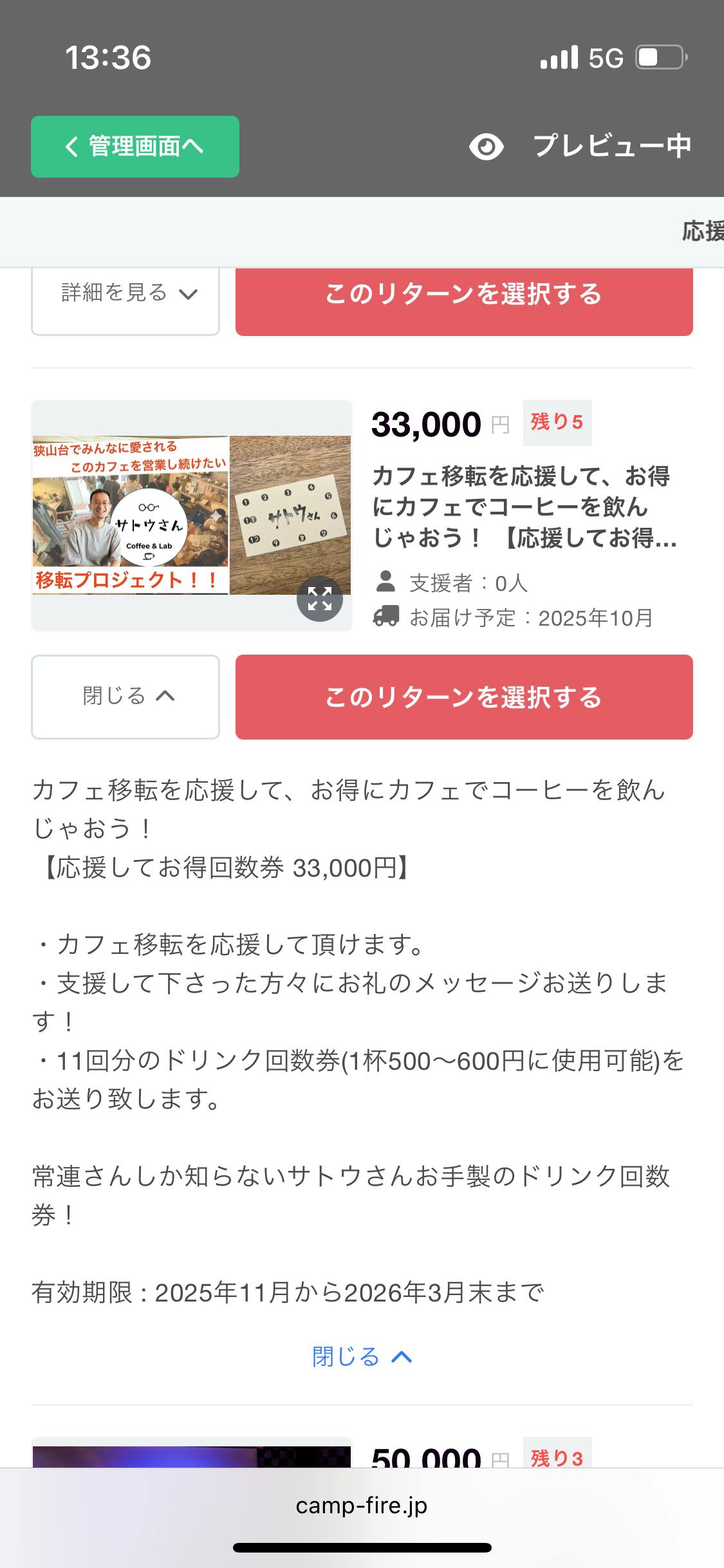 少し前にリターンを追加したと投稿していたのですが、最後確認のボタンを押しておらずで追加出来ていませんでした。