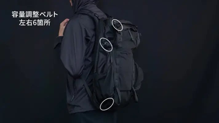 左右6箇所の容量調整ベルトは内容量に応じてベルトを引き締めることでバックパックの容量を最適なサイズに調整します。