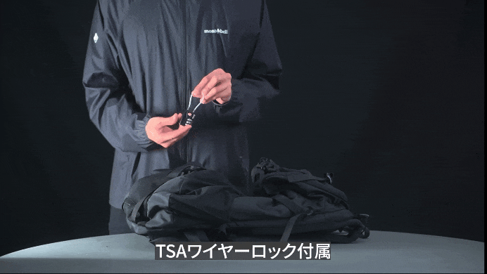 移動時や荷物から少し離れるときにも施錠可能なTSAロックが付属します。一つでメインコンパートメントとPCスリーブのジッパーの施錠が可能です。
