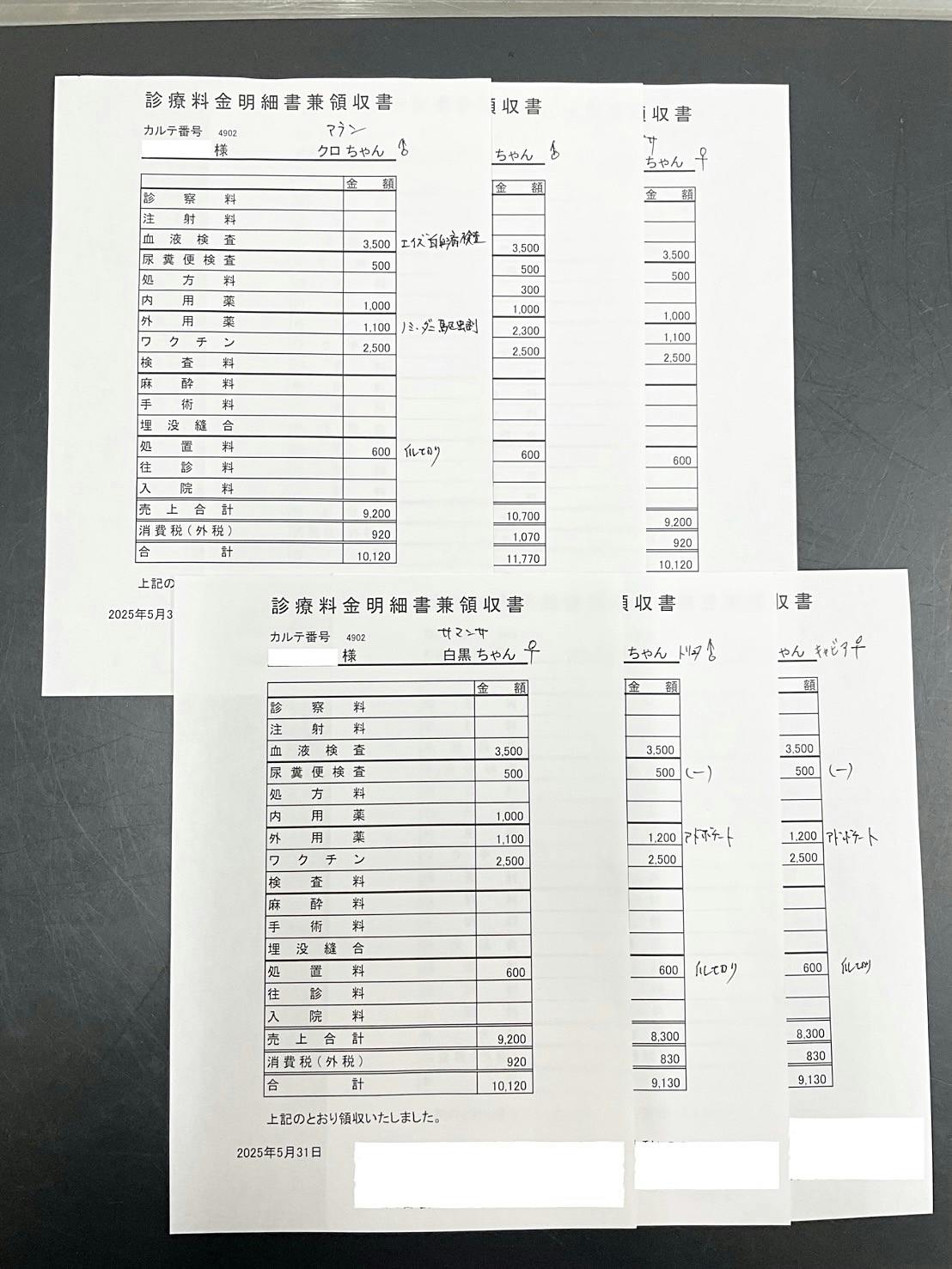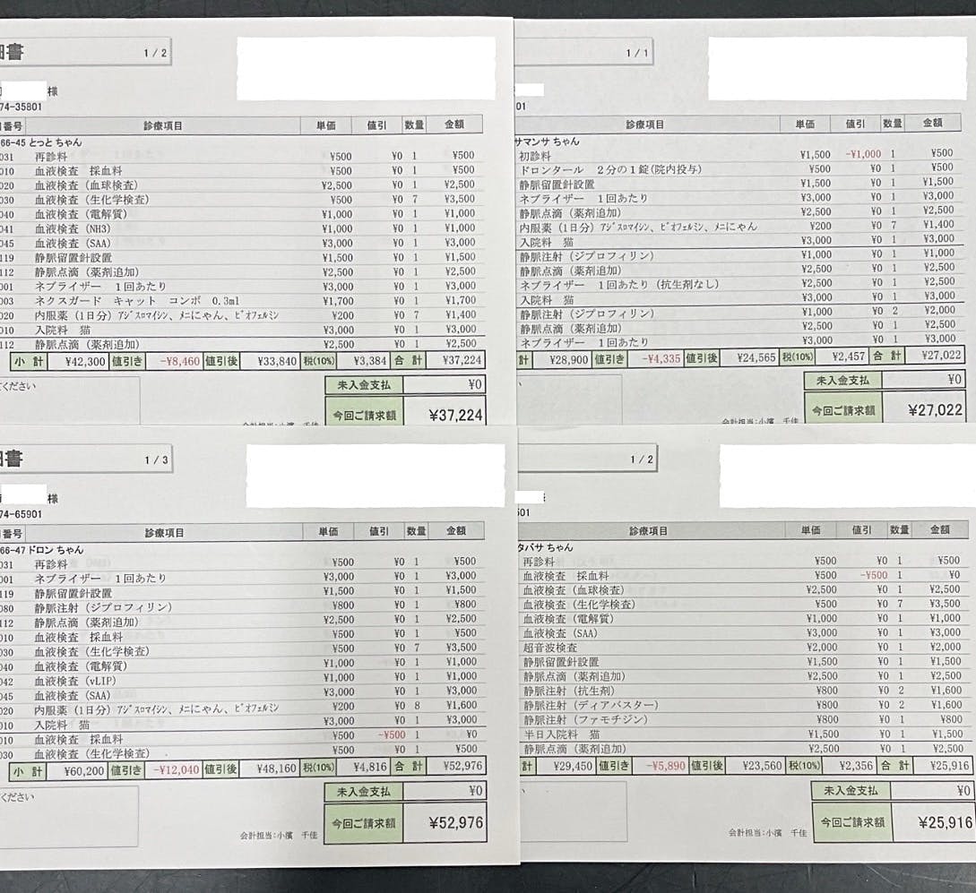 ⚫︎病気の治療費 風邪、下痢、皮膚病等(血液検査、エコー検査、検便、注射、点滴、内用薬、外用薬、入院費等)×7匹分=241,000円