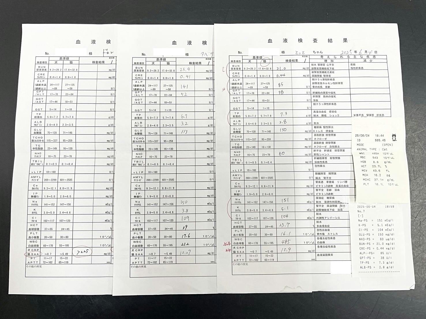 道に猫が倒れている!との通報。現場に行くと動けない仔猫がおり即病院へ。血液検査の数値がかなり悪く、恐らく毒性の強いものを食べたのでは?とのお話しでした。翌日ビニールみたいなものを大量に嘔吐。空腹でゴミを漁ったのでしょう。