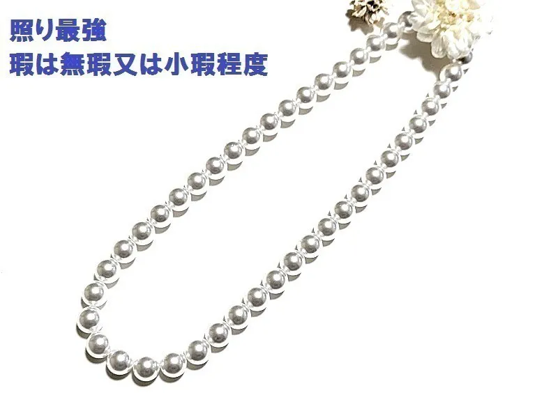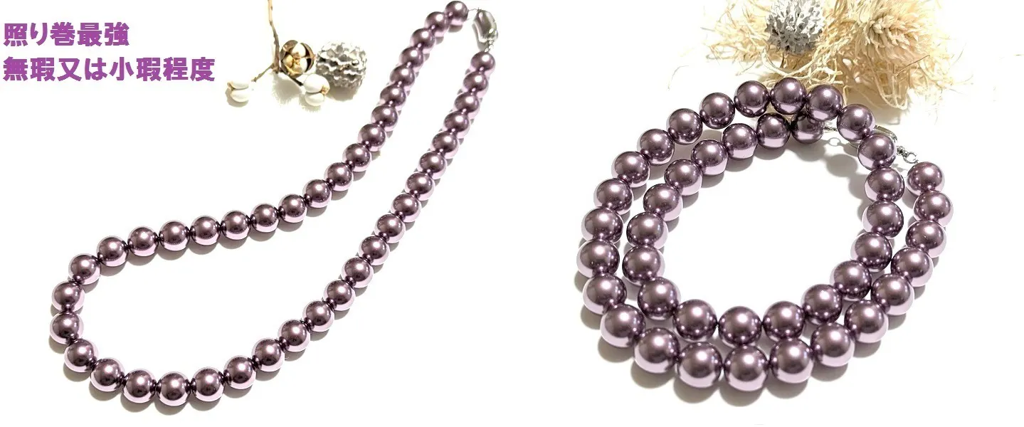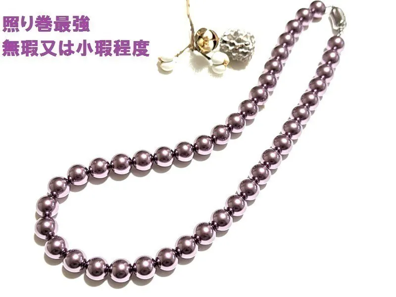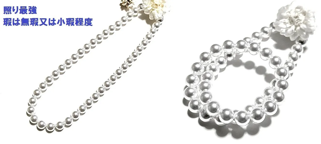 エジソンパールはほぼ真円です。サイズは10mm UPで、肌は滑らかで、強い光沢があり、