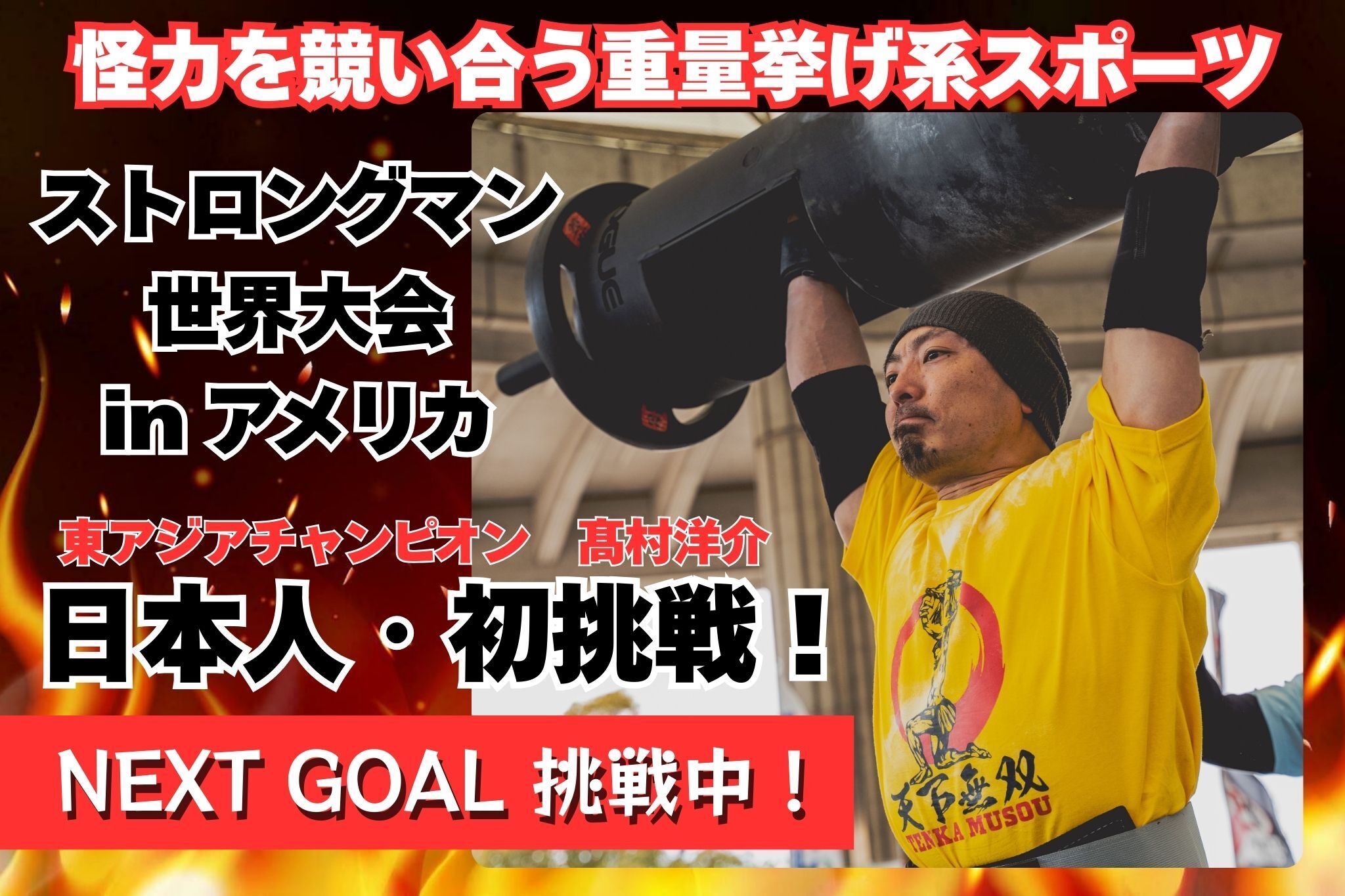 こんにちは!髙村洋介です。皆様のおかげで、目標金額50万円を達成することが出来ました!本当にありがとうございます!たくさんの方にご支援いただけていること、とても嬉しく、身の引き締まる思いです。そして日本ではまだマイナーなストロングマンというスポーツを、さらに多くの方に知っていただきたいという思いから、ネクストゴールを設定させていただきたいと思います!【ネクストゴール】80万円!マイナースポーツのため練習場所、機材は限られています。ネクストゴールにてご支援いただいた金額は、大会へ向けた練習機材や身体つくり、装備品のための費用として大切に使わせていただきます。日本ひいてはアジアにおける、ストロングマンの発展と次世代の選手への道しるべとして、ぜひご支援とご協力をいただきたく存じます。どうぞよろしくお願いいたします!!