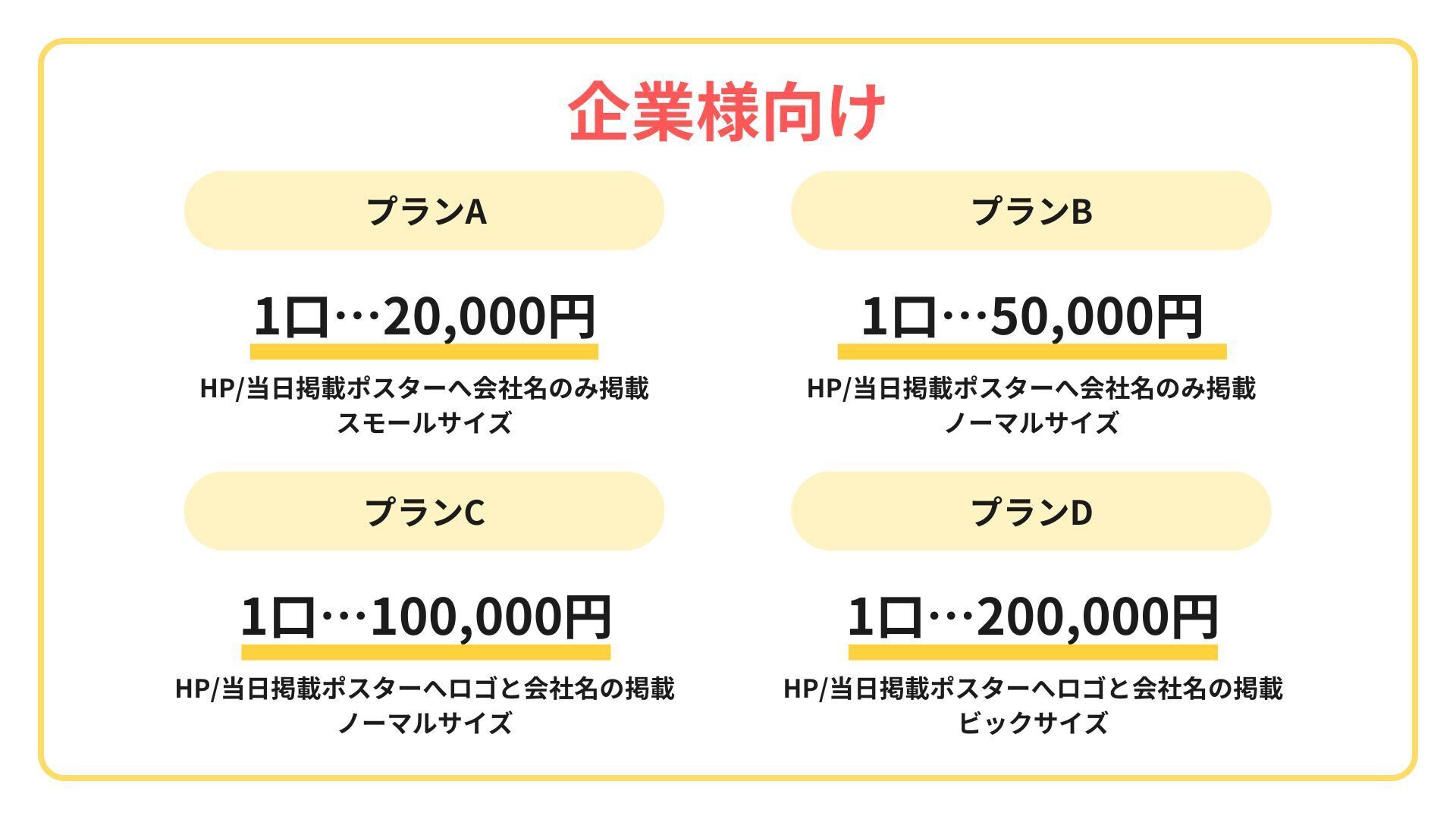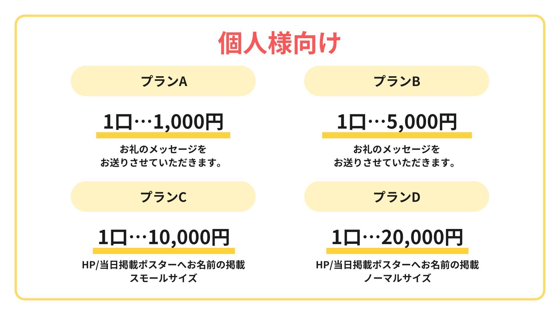企業様向け/個人様向けの2種類を設定させていただきました。個人様向けの1,000円/5,000円のリターンは同じとなります。