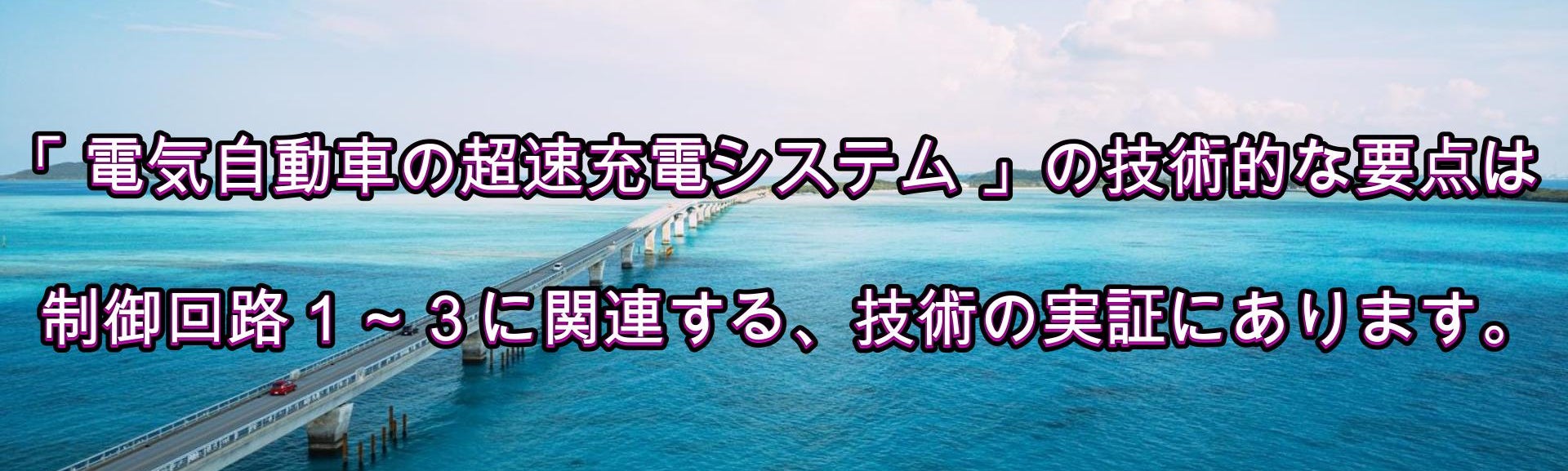 この 出願、審査期間の間に、私たちは、この「 電気自動車の超速充電システム 」について、その技術的な要点である、制御回路 1~3 に関連する、実証技術の開発が必要と考えており、その制御回路 1~3 について、制御最適化を実証する技術の開発を行う計画ですが、詳細はのちの「 現在の準備状況 」で後述します。