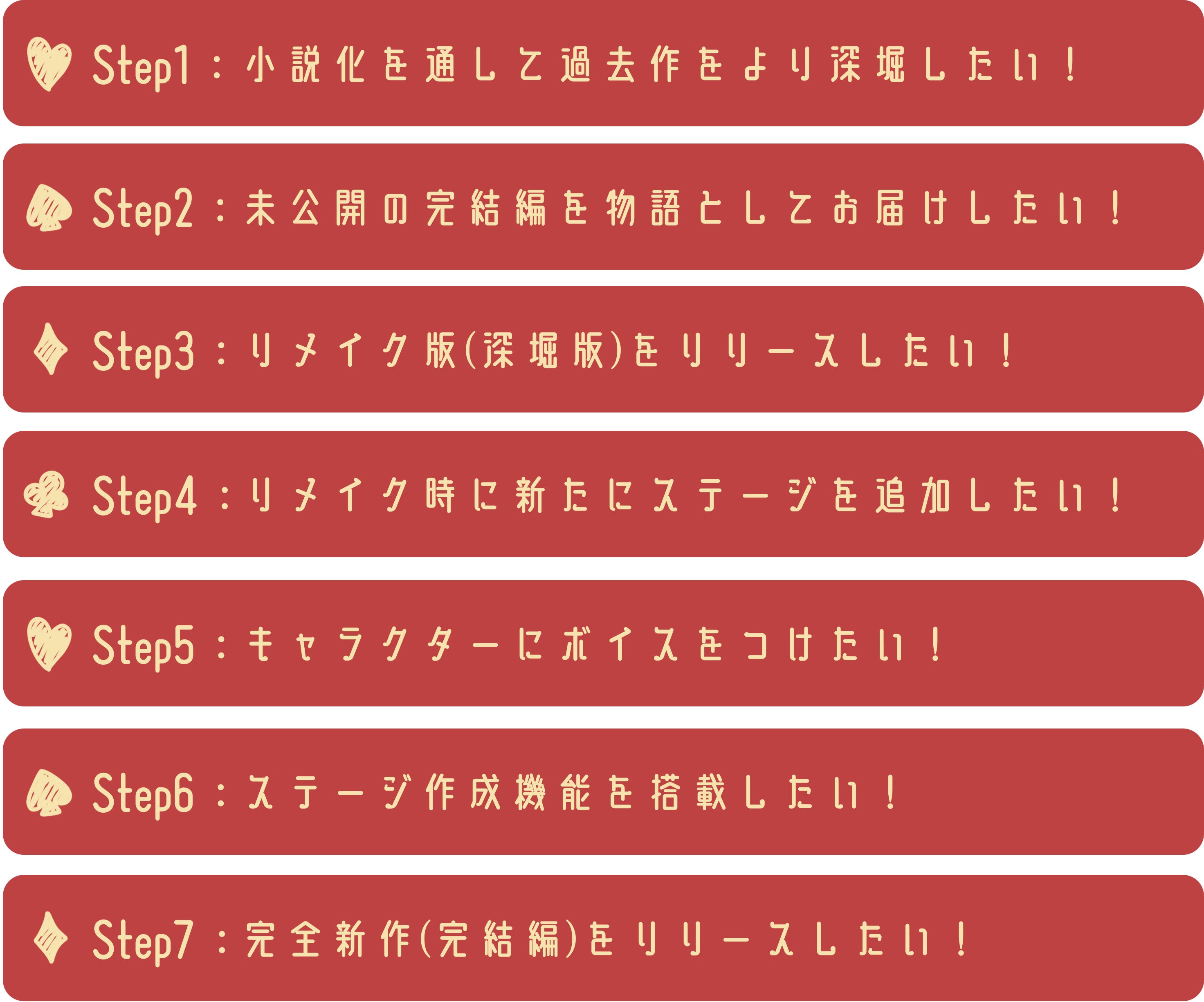 名目上はストレッチゴールという形を取っておりますが、私たちが本当に目指しているのは「最終章となる新作ゲームの製作」です。しかし、All or Nothing形式でご支援いただいた皆さまに対し、目標未達成という結果だけを残してプロジェクトを終えることは、本意ではありません。