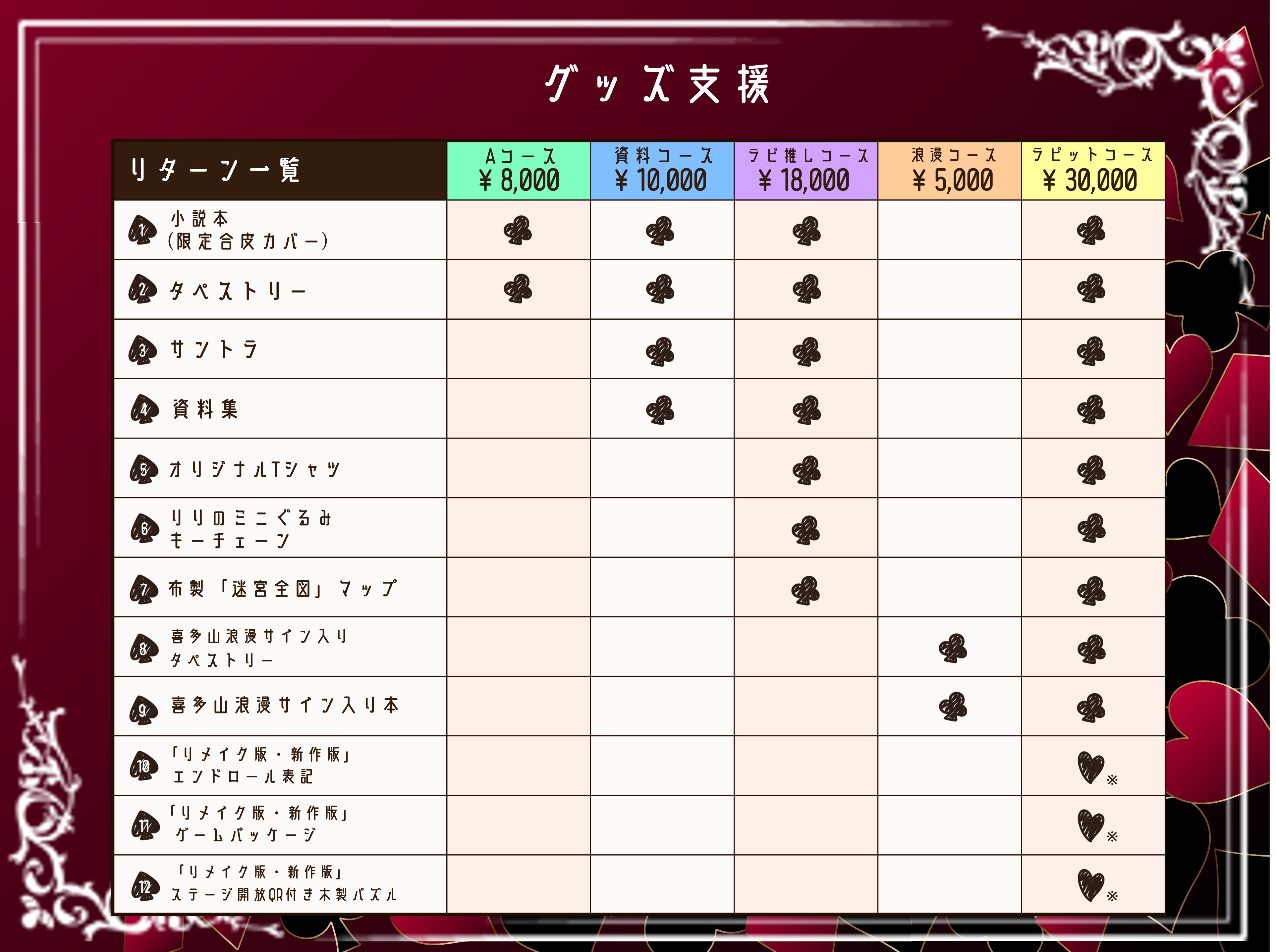 アクリルスタンド全15種全てがゲットできるコースです。種類:アリス/リリ/アリシア/ハートの女王/チェシャ猫/トランプ兵(ダイヤ)/トランプ兵(スペード)/トランプ兵(クローバー)/帽子屋/グリフォン/ニセウミガメ/カニ/いもむし/おばけ/ブラックリリ