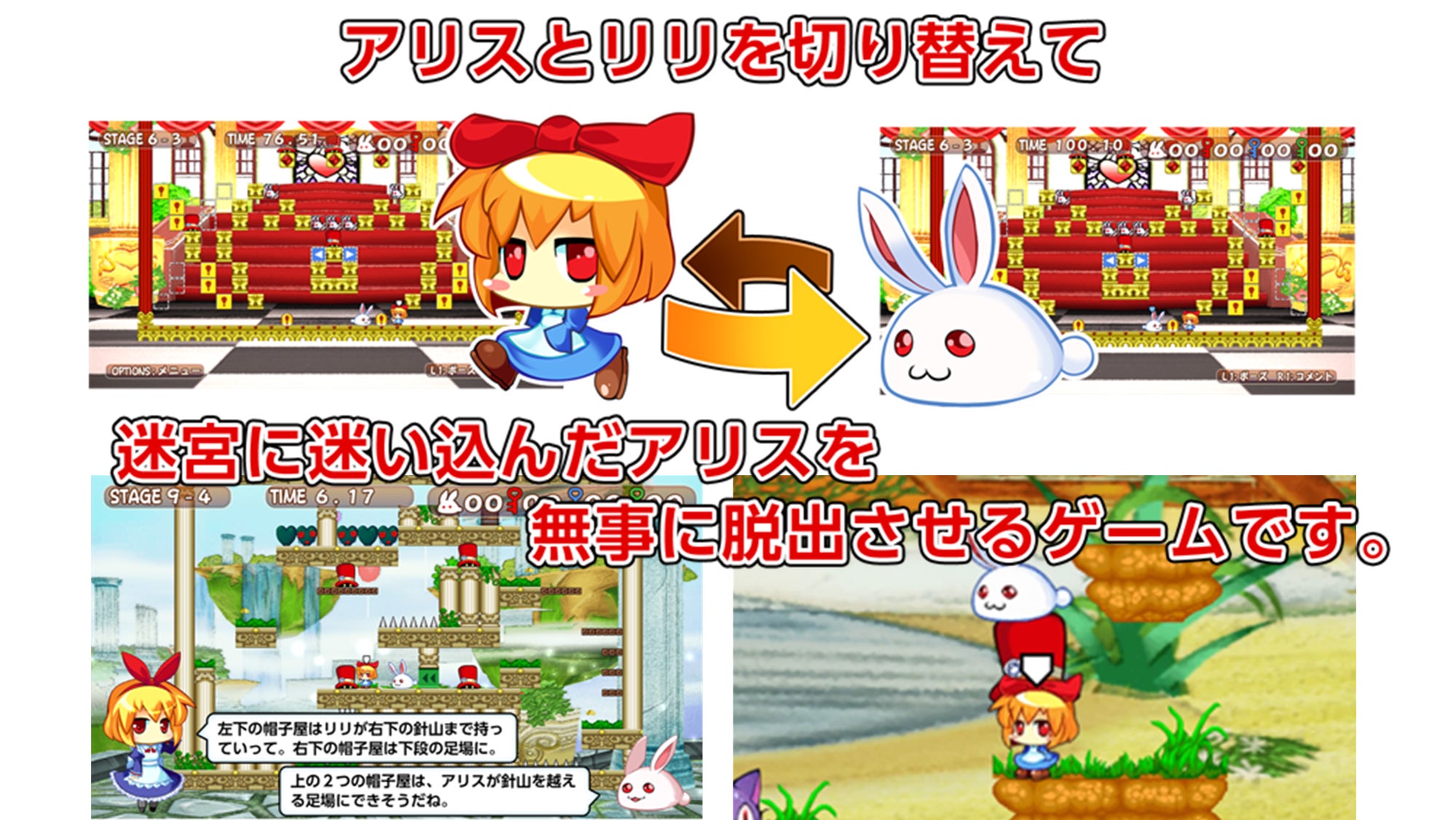 不思議の国のアリスをモチーフにした2Dアクションパズル。うさぎのリリの自爆などを駆使し、多彩なギミックが待つ迷宮を脱出していく作品として当初は斬新なゲーム性として多くの方の手に取っていただきました。