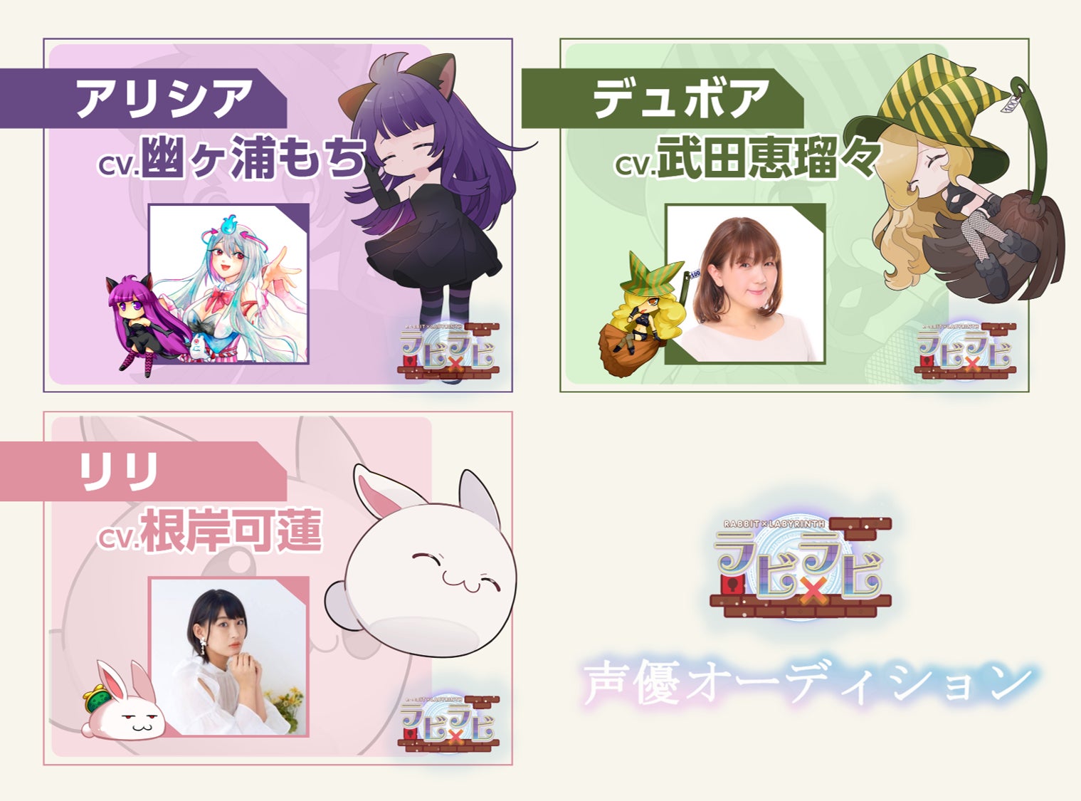 2026/02/04 10:47皆さま、こんにちは。『ラビ×ラビ』シリーズ広報担当です。声優オーディションの結果が発表されました!去年の末に発表と言いながら、お待たせして大変申し訳ございませんでした……ほんっっっとうに素晴らしい魅力的な方が多く、想定した期間を厳守するのも大切ですが、時間が無いのを理由に決めてしまうのもよくないと思い、発表が遅れてしまいました。改めて申し訳ございませんでした。厳正なる選考の結果、以下3名の方に声優をお願いする運びとなりました!■アリシア:cv.幽ヶ浦もち(https://x.com/MochiKasugaura)■デュボア:cv.武田恵瑠々 (https://x.com/erutaro)■リリ:cv.根岸可蓮(https://x.com/doki_karen1118)サンプルボイスは既に非公開となっているため、実際のお声は今後公開されるPVなどをお待ちいただければと思います!……残りのキャラクターの声優も気になりますよね?そちらも今後順番に発表いたしますので楽しみにお待ちください!それでは今後ともラビ×ラビシリーズを何卒よろしくお願い申し上げます。 もっと見る活動報告14:リターン品「リリのキーホルダー」のサンプルが完成しました!