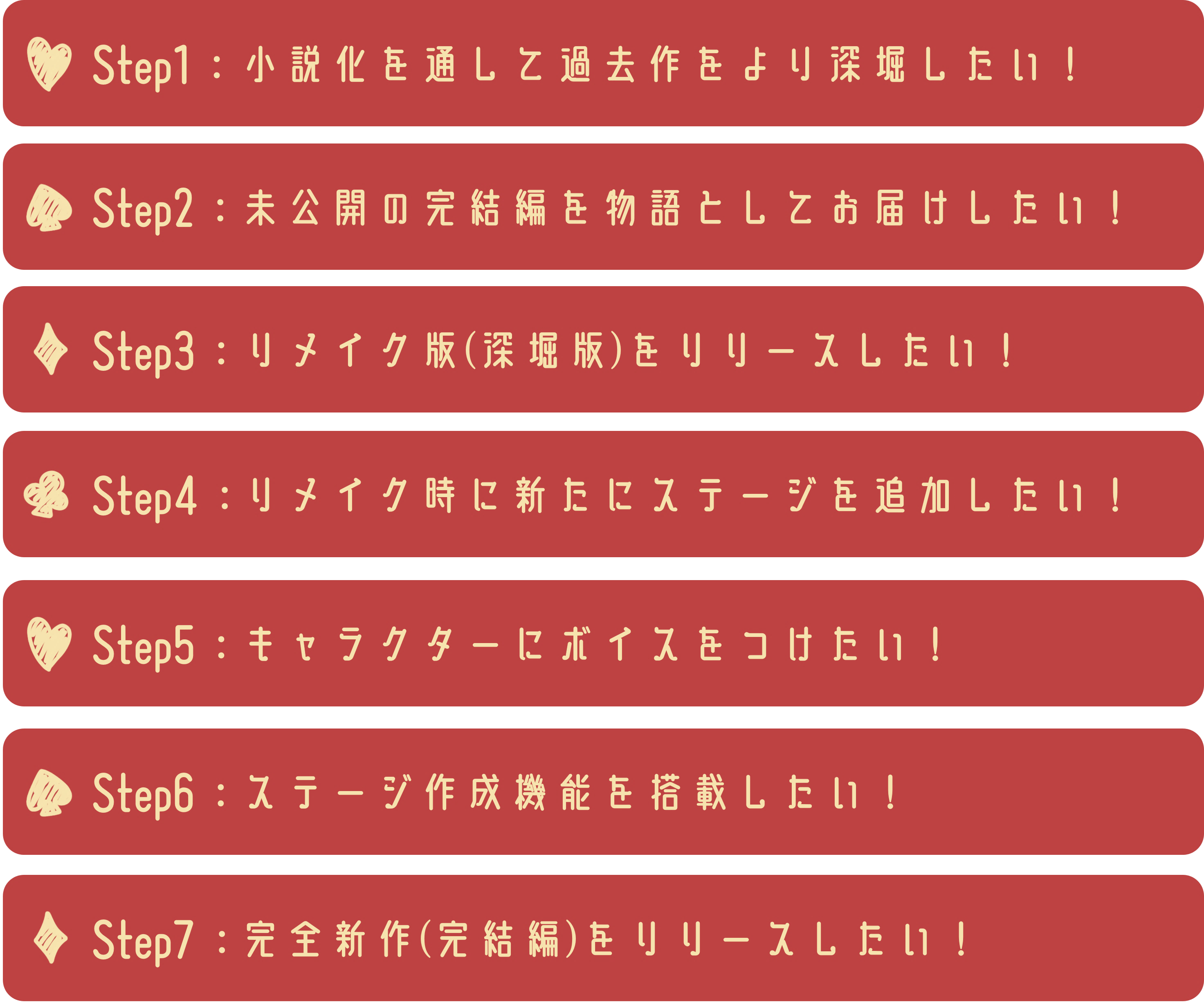名目上はストレッチゴールという形を取っておりますが、私たちが本当に目指しているのは「最終章となる新作ゲームの製作」です。しかし、All or Nothing形式でご支援いただいた皆さまに対し、目標未達成という結果だけを残してプロジェクトを終えることは、本意ではありません。