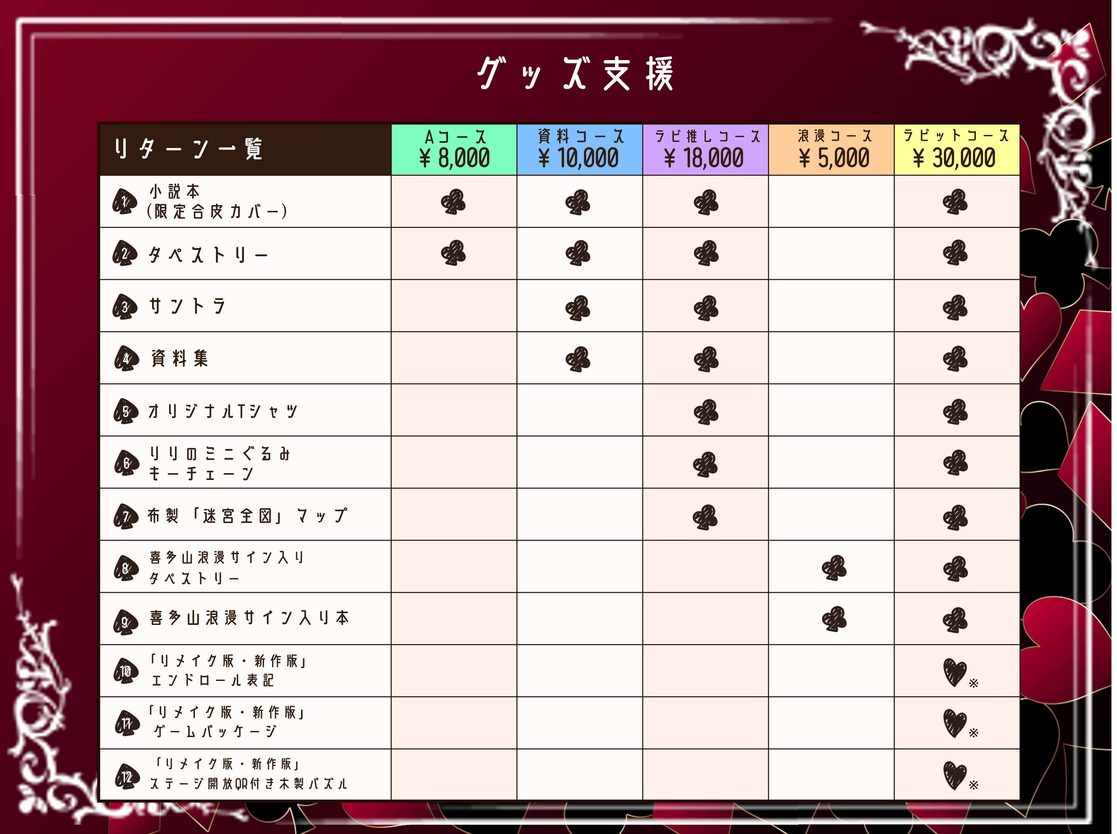 アクリルスタンド全15種全てがゲットできるコースです。種類:アリス/リリ/アリシア/ハートの女王/チェシャ猫/トランプ兵(ダイヤ)/トランプ兵(スペード)/トランプ兵(クローバー)/帽子屋/グリフォン/ニセウミガメ/カニ/いもむし/おばけ/ブラックリリ