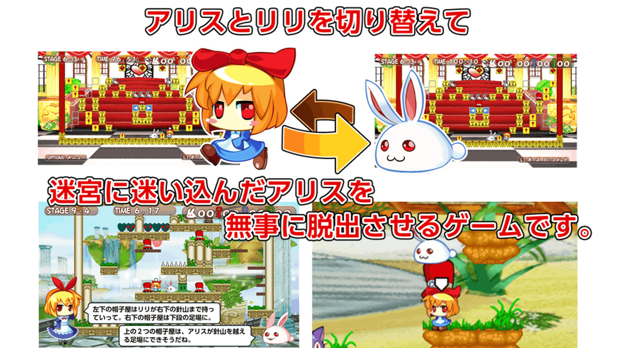 不思議の国のアリスをモチーフにした2Dアクションパズル。うさぎのリリの自爆などを駆使し、多彩なギミックが待つ迷宮を脱出していく作品として当初は斬新なゲーム性として多くの方の手に取っていただきました。
