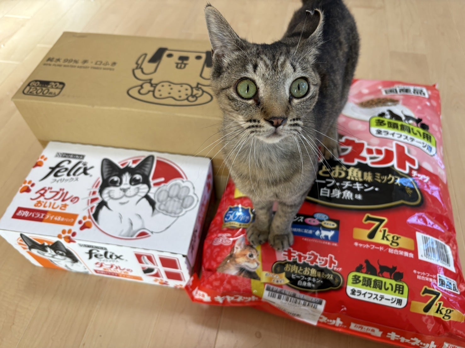 先日、皆さまからのご支援により猫砂、パウチ、ウェットフード、カリカリごはん、ケアに欠かせないウェットティッシュが届きました。